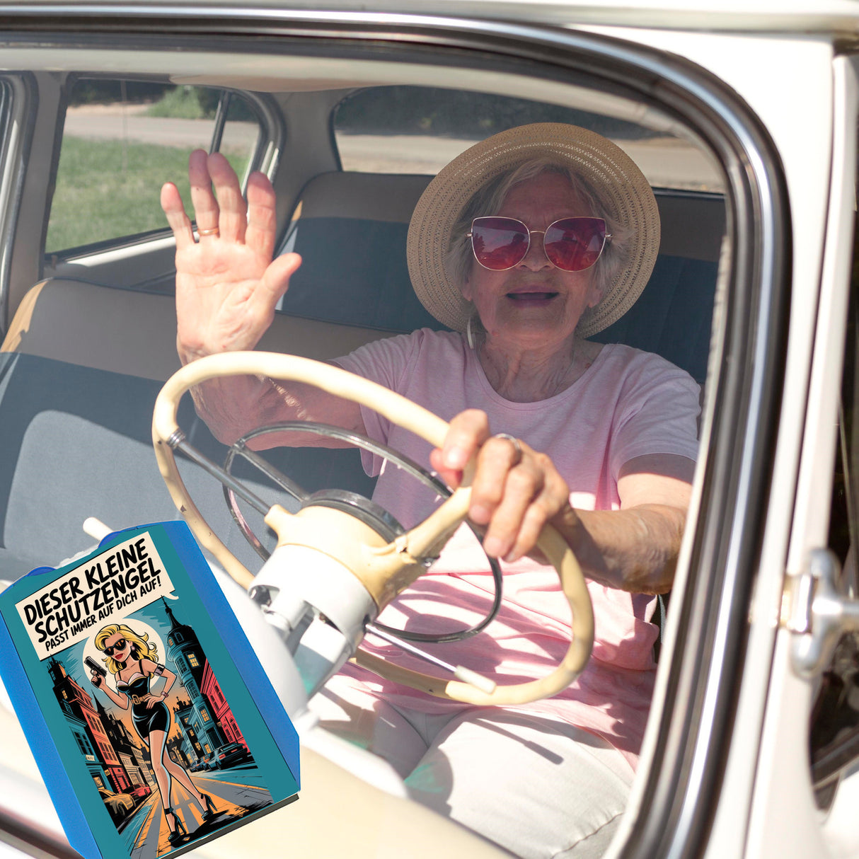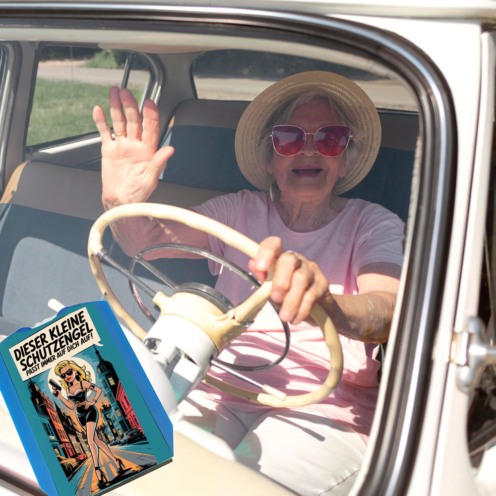 • Stell dir vor, du steigst ins Auto, und da ist sie – eine selbstbewusste blonde Frau, die mit Kleid, Sonnenbrille und einer Pistole in der Hand im Pop-Art-Stil als Parkscheibe in deinem Auto thront. Sie ist nicht nur ein Schutzengel, sondern auch ein wahrer Hingucker, der jeden Parkplatz zu ihrem Laufsteg macht.