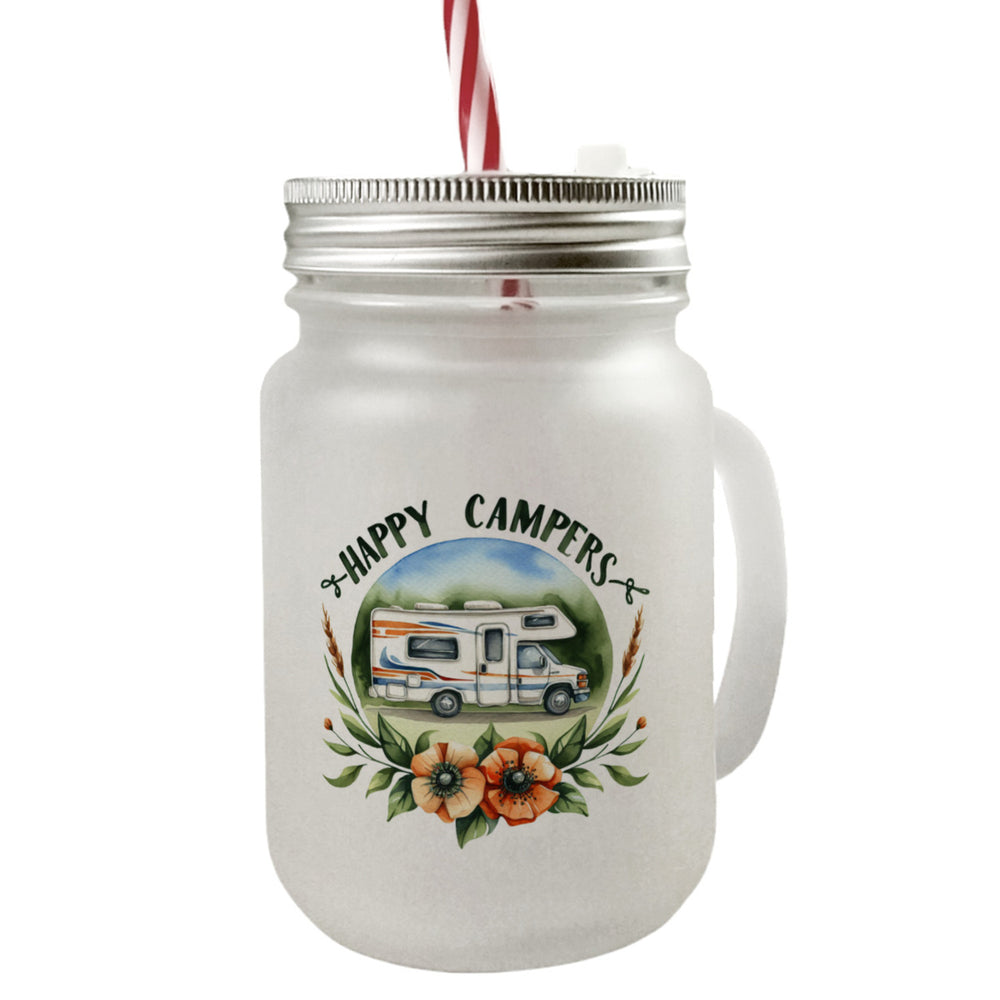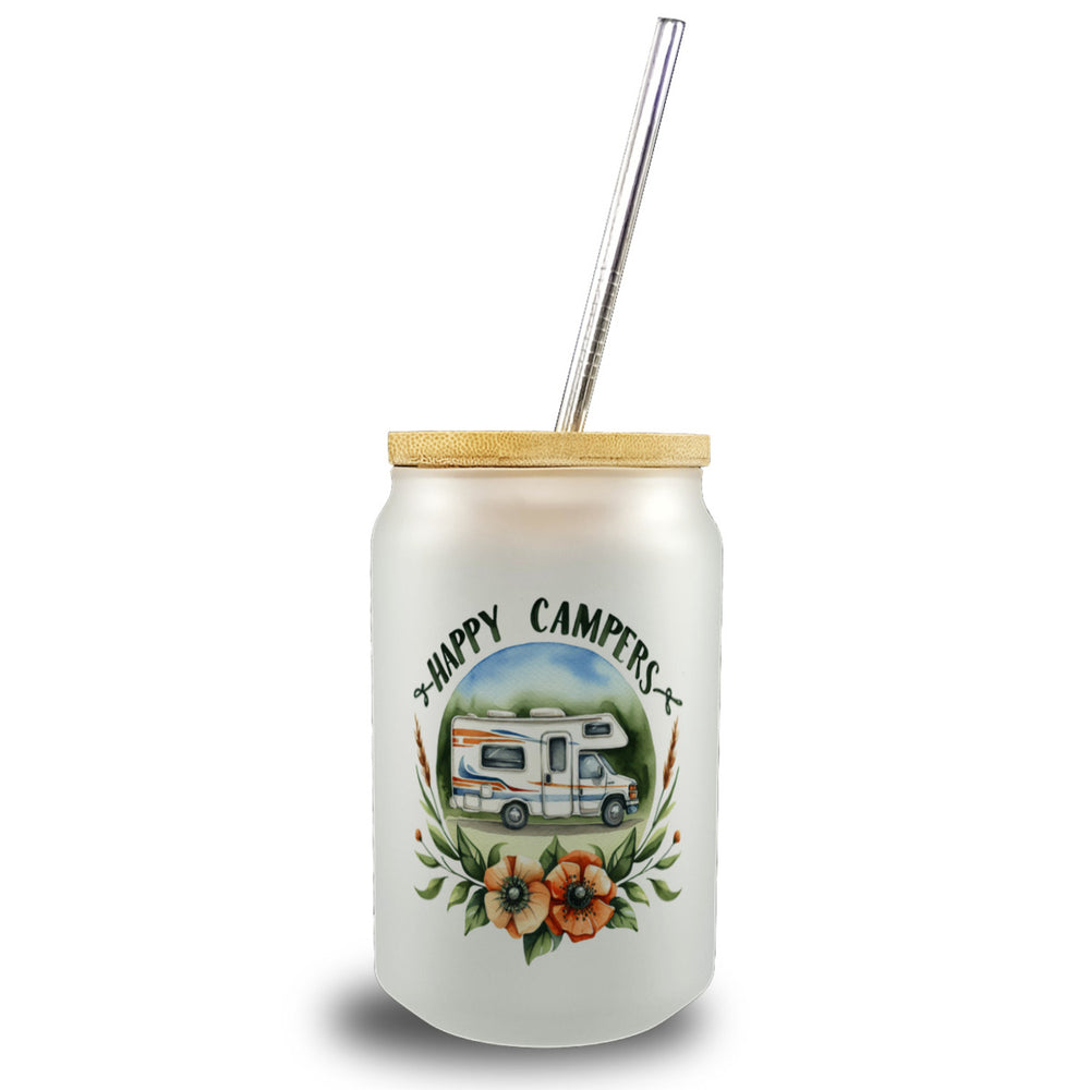 • Mach deine Campingausflüge noch fröhlicher mit dem Wohnmobil Happy Campers Trinkglas! Es zeigt ein charmantes Design mit einem stilisierten Wohnmobil und hübschen Blumen, umgeben von dem Spruch "Happy Campers". Ein Muss für alle Glücklichen Camper!