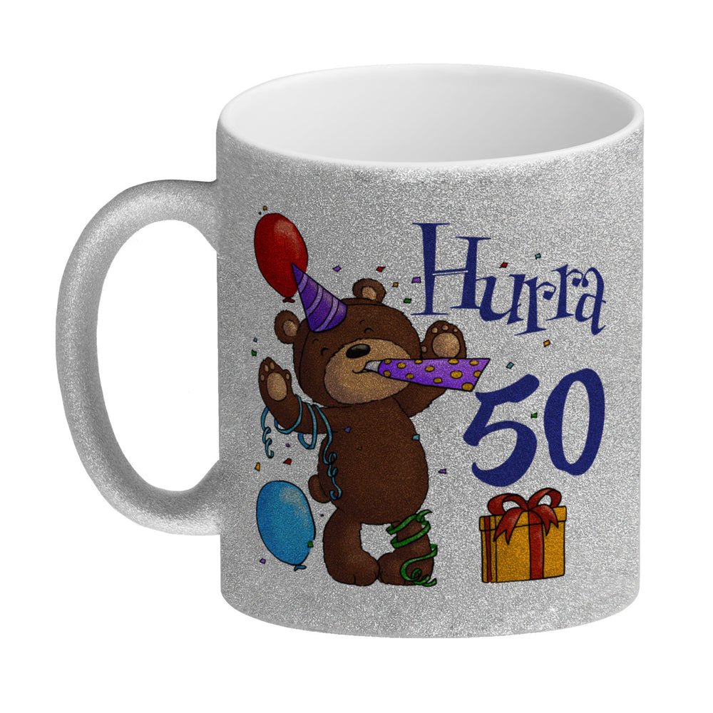 • 1x 50. Geburtstag Kaffeebecher mit lustigem Spruch: Teddy in der gewählten Ausführung