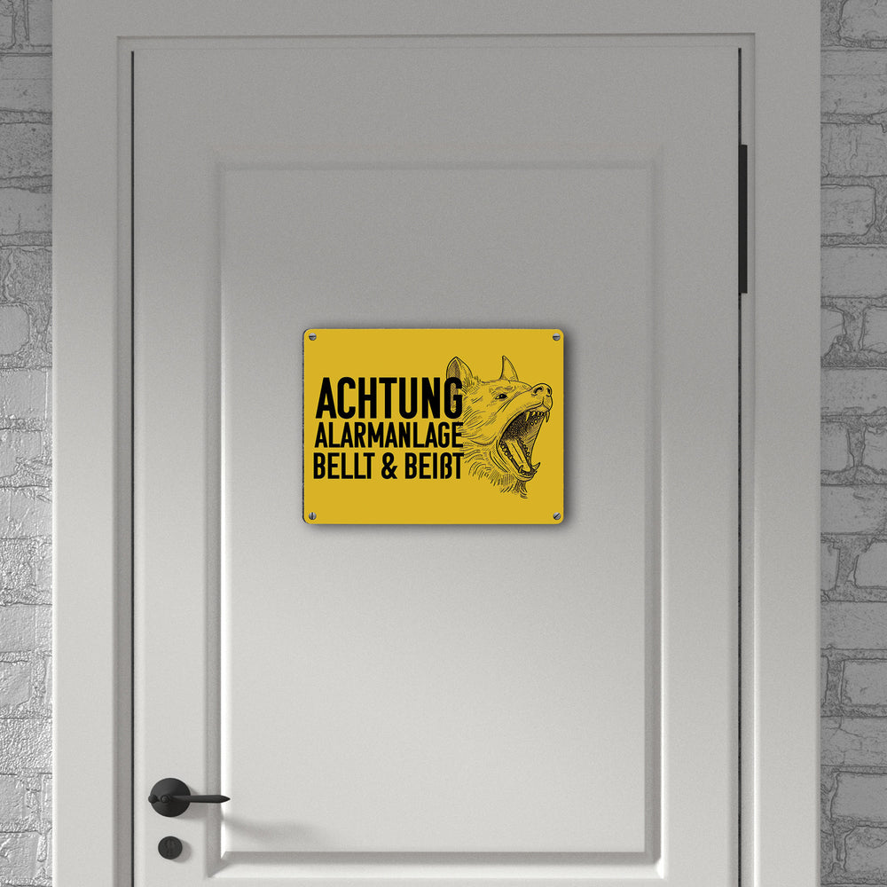 - 1x Achtung Alarmanlage bellt und beißt Metallschild mit Hunde Motiv in der gewählten Größe