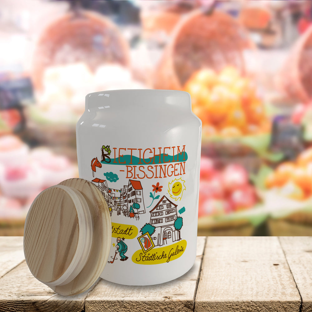 Die Bietigheim-Bissingen Wimmelbild Keksdose beeindruckt mit ihrer lebendigen Illustration. Sie zeigt einen charmanten Stadtplatz, belebt von fröhlichen Menschen, umgeben von prägnanten Gebäuden und geschmückt mit einem Sonnenschirm. Highlight: Ein Fahrra Hinweise: Material: Keramik und Holz / Volumen 650 ml