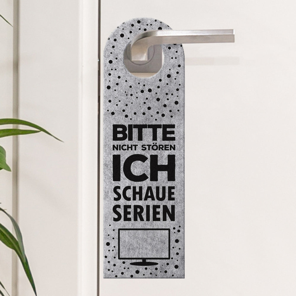 Der Bitte nicht stören, ich schaue Serien Türhänger in Grau ist die perfekte Lösung für alle Serienfans, die ihre Ruhe haben möchten. Der hochwertige Filz ist mit viel Sorgfalt und Liebe in unserer Manufaktur in Deutschland hergestellt. Die praktische Öffnung an der Oberseite des Türhängers ermöglicht es ihn einfach und schnell an der Türklinke zu befestigen. Egal ob als Einzelstück oder im Sparset - mit dem Bitte nicht stören, ich schaue Serien Türhänger kann man seine Mitmenschen informieren, dass man gerade ungestört seine Lieblingsserie anschauen möchte. Endlich mal wieder ruhig und ungestört seine Lieblingsserie genießen - dank des Bitte nicht stören, ich schaue Serien Türhängers kein Problem mehr!