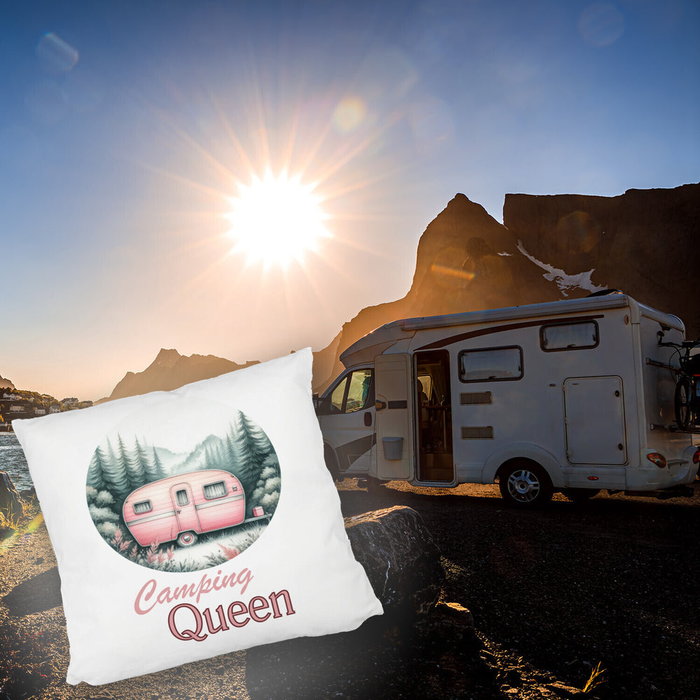 - Hast Du jemals daran gedacht, den Thron der Wildnis mit Stil zu erklimmen? Hier ist Dein Zepter: Das "Camping Queen Wohnwagen Kissen"! Rosa und prächtig, thronst Du damit auf jeder Picknickdecke. Dein Wohnwagen, abgebildet inmitten unberührter Natur, ruft "Lang lebe die Campingkönigin!"