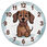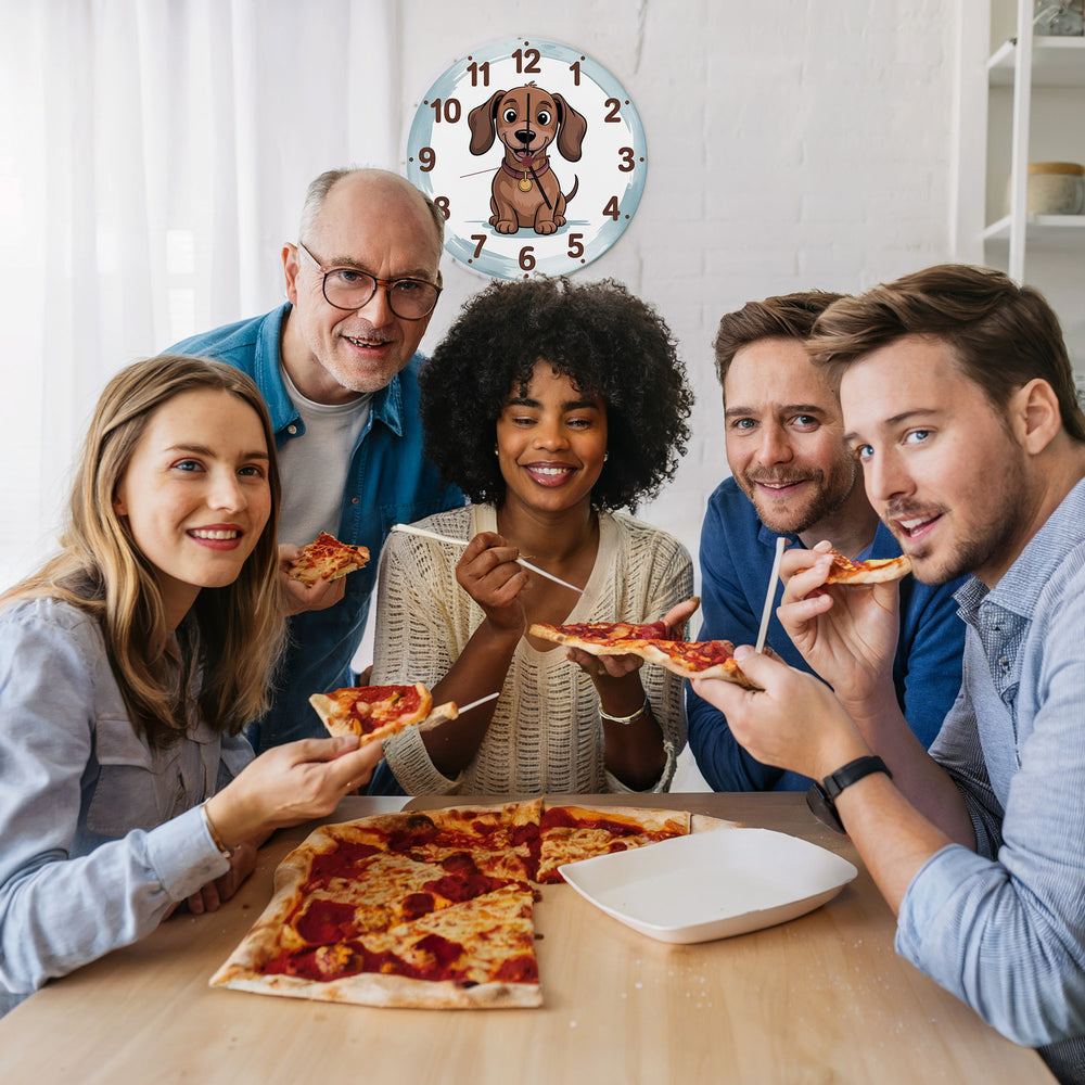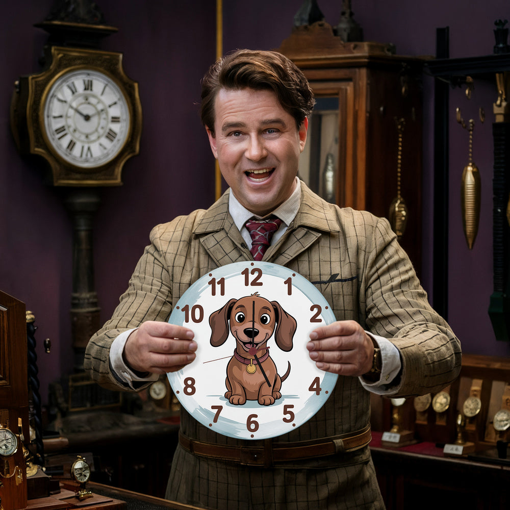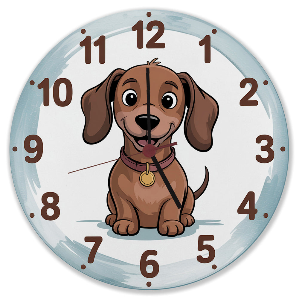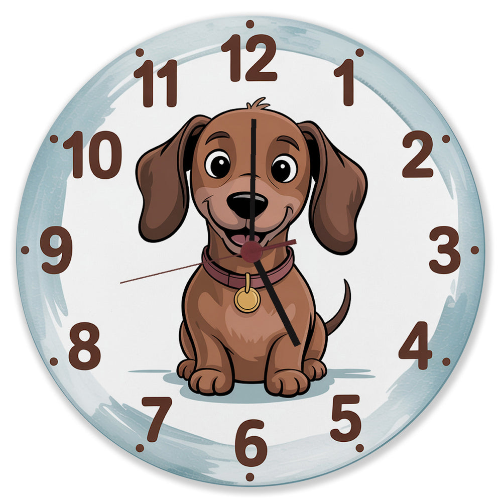 - Diese lustige Wanduhr zeigt einen fröhlichen braunen Dackel auf einem aquarellartigen hellblauen Hintergrund. Der Hund trägt ein braunes Halsband mit einem goldenen Anhänger und strahlt mit seinem lächelnden Ausdruck pure Freude aus. Die Uhr hat eine traditionelle Anordnung von braunen Zahlen und bringt eine spielerische Atmosphäre in jedes Kinderzimmer.