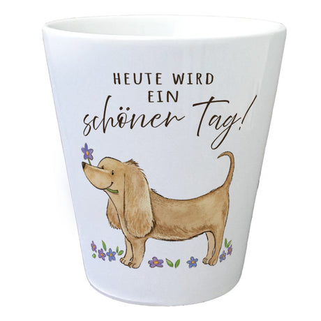 Dackel mit Blume Blumentopf mit Spruch Heute wird ein schöner Tag