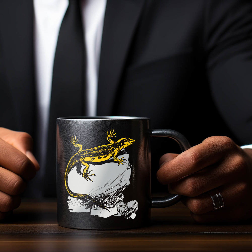 • Diese schwarze Tasse zeigt eine freche Eidechse in leuchtendem Gelb, die entspannt auf einem grauen Felsvorsprung chillt. Das lustige Reptilien-Motiv bringt Farbe in deinen Alltag und macht den Morgenkaffee zum Highlight. Ein Muss für alle Reptilien-Fans und Naturliebhaber!