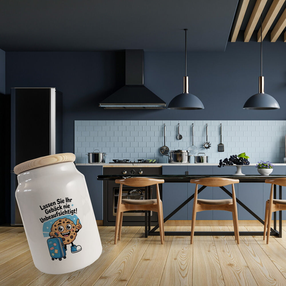 - Diese humorvolle Keksdose zeigt einen fröhlichen Keks-Charakter mit Rollkoffer im Flughafen-Chic. Mit ausdrucksstarken Augen und einem selbstbewussten Grinsen zieht er alle Blicke auf sich. Der leuchtend blaue Koffer, verziert mit niedlichen Reiseaufklebern, rundet das verspielte Design ab. Der freche Spruch "Lassen Sie Ihr Gebäck nie unbeaufsichtigt!" sorgt für Lacher!