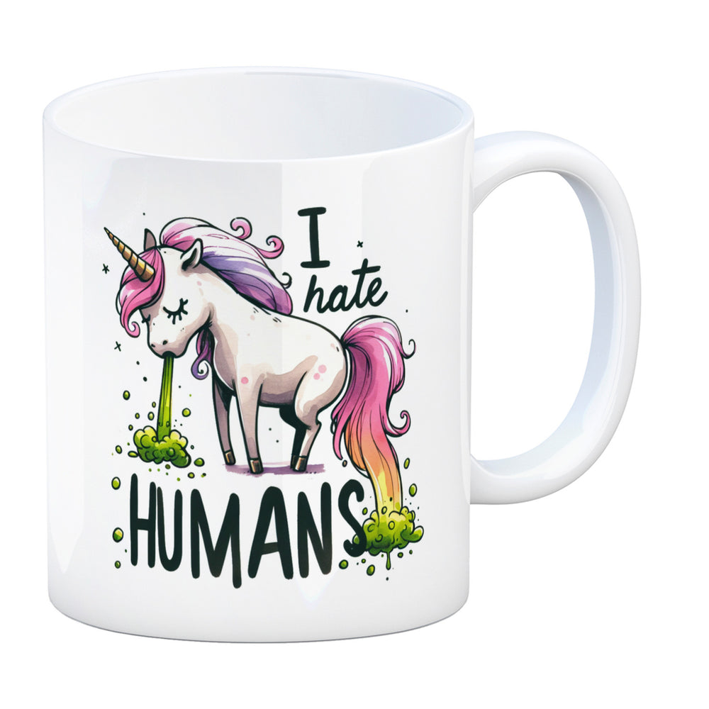 - 1x Kotzendes Einhorn Kaffeebecher mit Spruch I hate Humans in der gewählten Ausführung