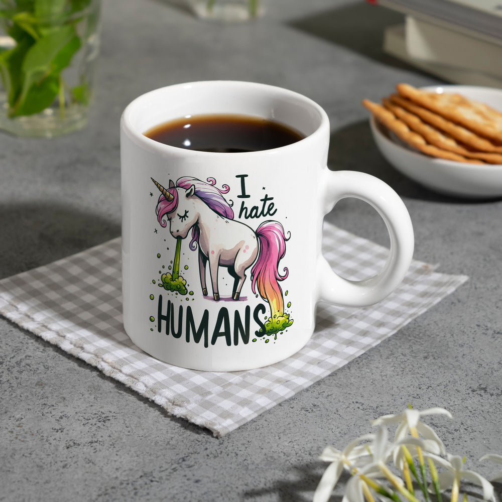 Kotzendes Einhorn Kaffeebecher mit Spruch I hate Humans