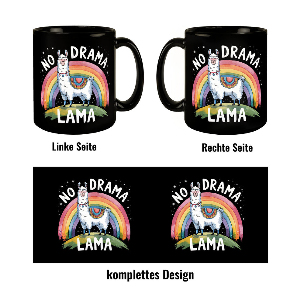 - Guten Morgen! Beginne deinen Tag mit einer Tasse Humor und Gelassenheit. Unsere "No Drama Lama" Kaffeetasse zeigt ein fröhliches Lama, das auf einem Hügel steht und von einem Regenbogen gekrönt wird. Der schwarze Hintergrund lässt die lebendigen Farben des Aquarells strahlen. So wird jeder Schluck Kaffee zum Erlebnis!