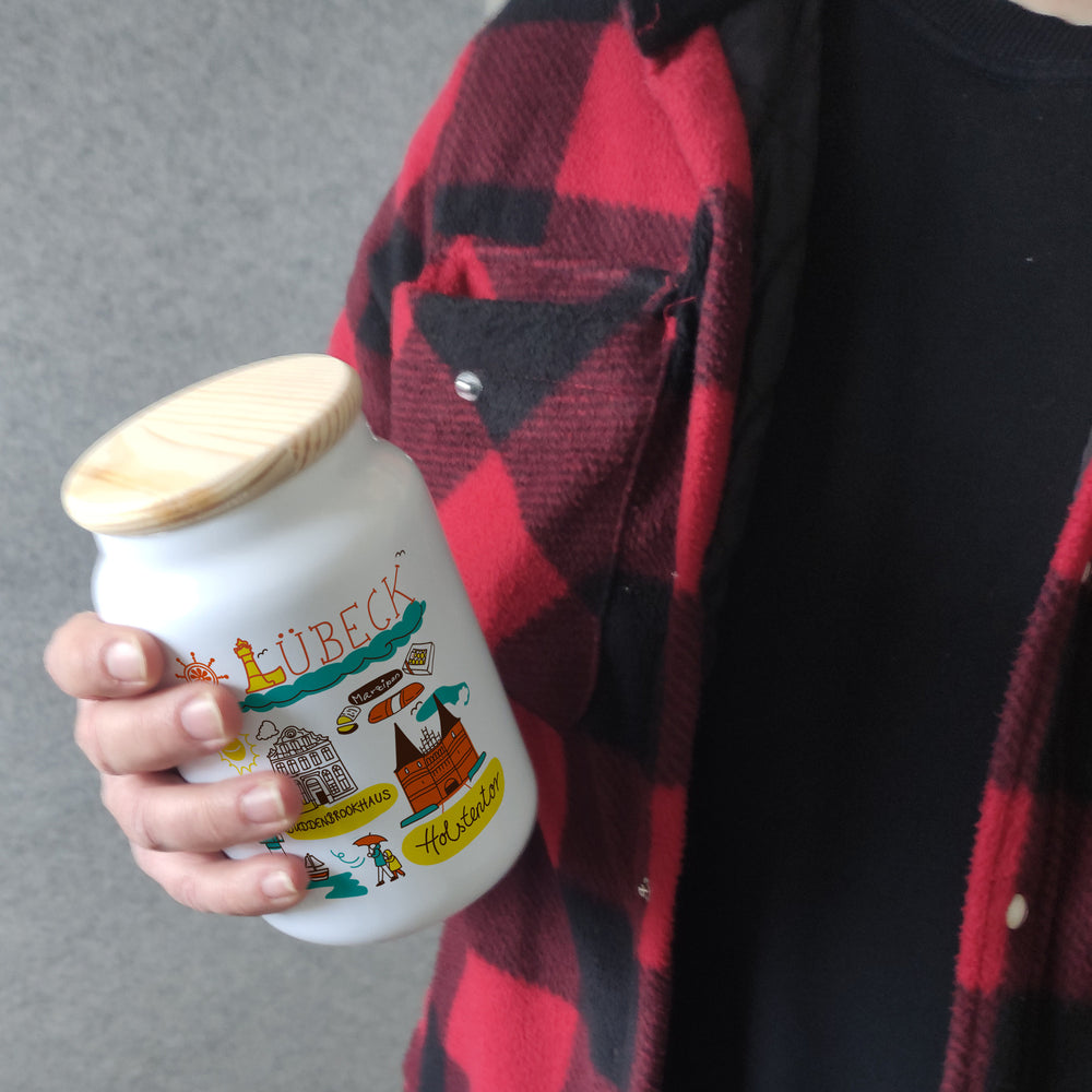 - Diese Keksdose ist ein wahrer Hingucker! Mit einem lebhaften und farbenfrohen Lübeck-Motiv zeigt sie den Leuchtturm, die Kirche und das Holstentor spielerisch und charmant auf einer horizontalen Dose. Die Sonne lächelt, eine Person kämpft mit dem Regenschirm und der Stadtname 'Lübeck' ist prominent zu sehen.
