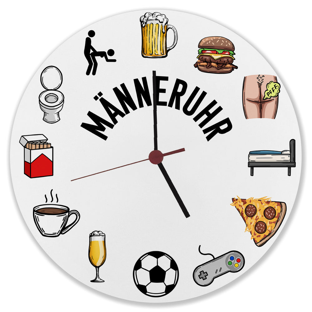 - Männer verfolgen Männeraktivitäten. Mit dieser witzigen Uhr weißt du genau, wann du welche Aktivitäten auszuführen hast. Die nicht ganz ernst gemeinte Uhr passt perfekt für Männer, die gerne Spaß haben und über sich selbst lachen können.