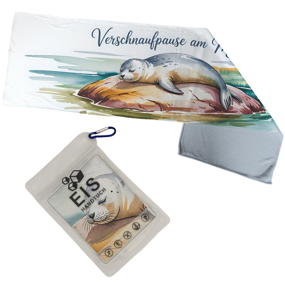 - Dieses Eishandtuch besticht durch ein charmantes Aquarelldesign mit einer entspannten Robbe, die gemütlich auf einem rötlich-braunen Felsen ruht. Die Farben, die über das Motiv fließen, vermitteln ein Gefühl von Ruhe und Gelassenheit, während der Spruch "Verschnaufpause am Meer" in die Meereslandschaft eingearbeitet ist.