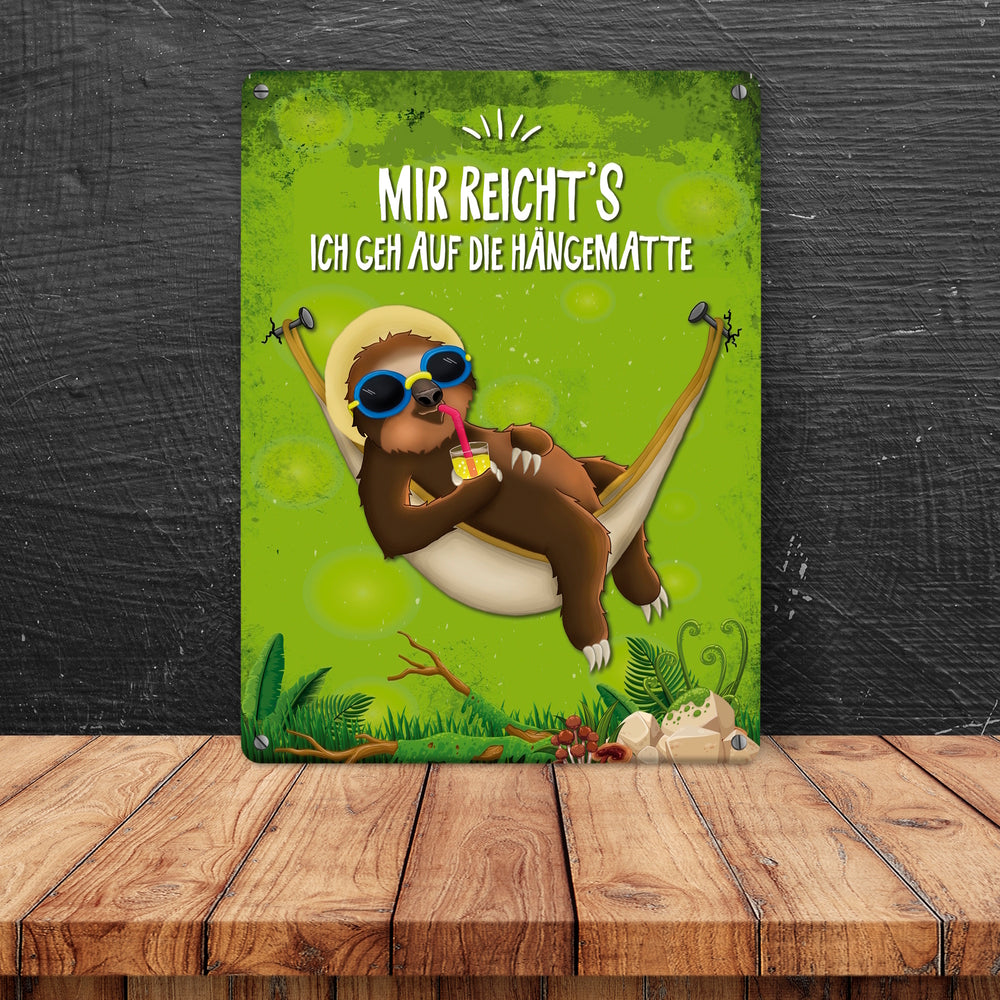 Metallschild mit Faultier in Hängematte Motiv und Spruch: Mir reicht's ich geh auf die Hängematte