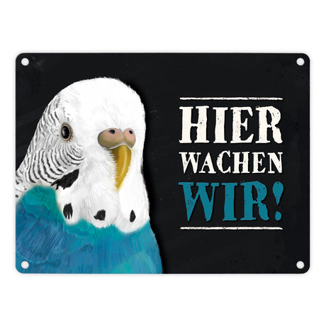Metallschild mit Wellensittich blau Motiv und Spruch: Hier wachen wir!