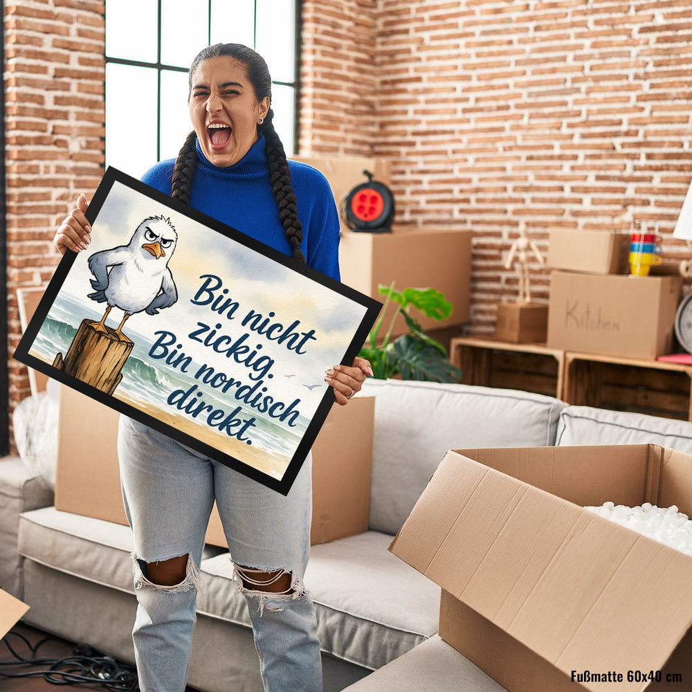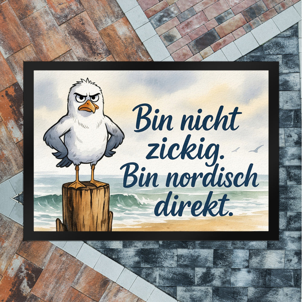• Diese Fußmatte ist ein echter Hingucker: Eine mürrische Möwe thront auf einem Holzpfosten am Strand. Mit grauen Flügeln und einem orange-gelben Schnabel schaut sie unzufrieden drein. Der marineblaue Spruch "Bin nicht zickig. Bin nordisch direkt." sorgt für Schmunzeln. Ein Aquarell-Hintergrund mit Strand und Ozean vollendet den nordischen Look.