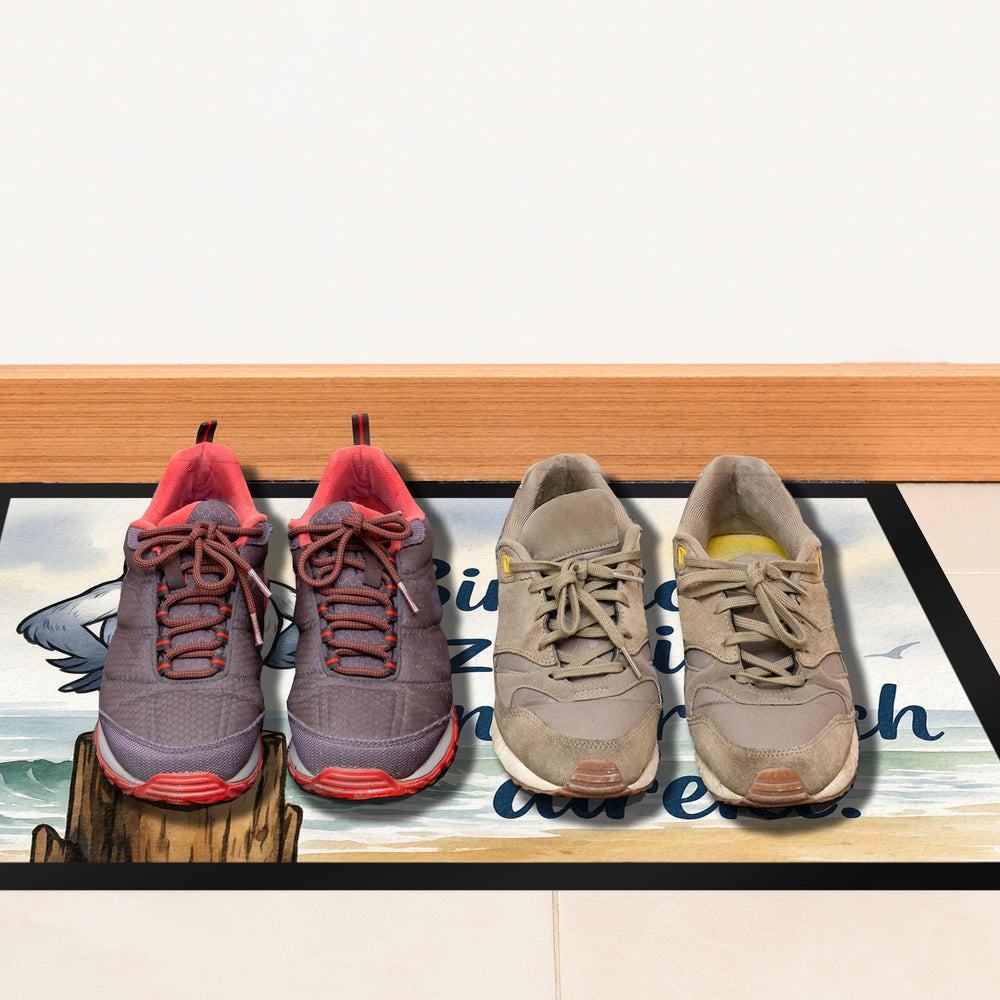 Setze ein fröhliches und maritimes Zeichen in deinem Heim mit der Möwe am Strand Fußmatte! Diese charmante Fußmatte vereint Humor und Stil und sorgt bei jedem Betreten für ein Lächeln. Perfekt für Küstenliebhaber oder jene, die sich der nordischen Brise verbunden fühlen – und das alles aus hochwertigen Materialien! Unsere Fußmatte zeigt eine freche Möwe, die auf ihrem Holzpfosten sitzend, grantig in die Welt schaut. Der Spruch Bin nicht zickig. Bin nordisch direkt. in marinem Blau bringt den typisch nordischen Humor in dein Zuhause. Der bezaubernde Aquarell-Hintergrund aus Strand und Meer rundet das Design ab und erinnert dich täglich an die frische Brise der Küste.Hergestellt aus pflegeleichter Kunstfaser, ist diese Fußmatte nicht nur ein Hingucker, sondern auch extrem funktional. Die rutschfeste Gummiunterseite sorgt für Sicherheit, egal wo du sie platzierst. Ob als herzlicher Empfang in deinem eigenen Haus oder als witziges Geschenk für einen lieben Menschen – die Möwe am Strand Fußmatte ist ein toller Gesprächsstarter.Gönne deinem Eingangsbereich dieses Stück Küste und lass den frischen Wind nordischer Direktheit in dein Leben!