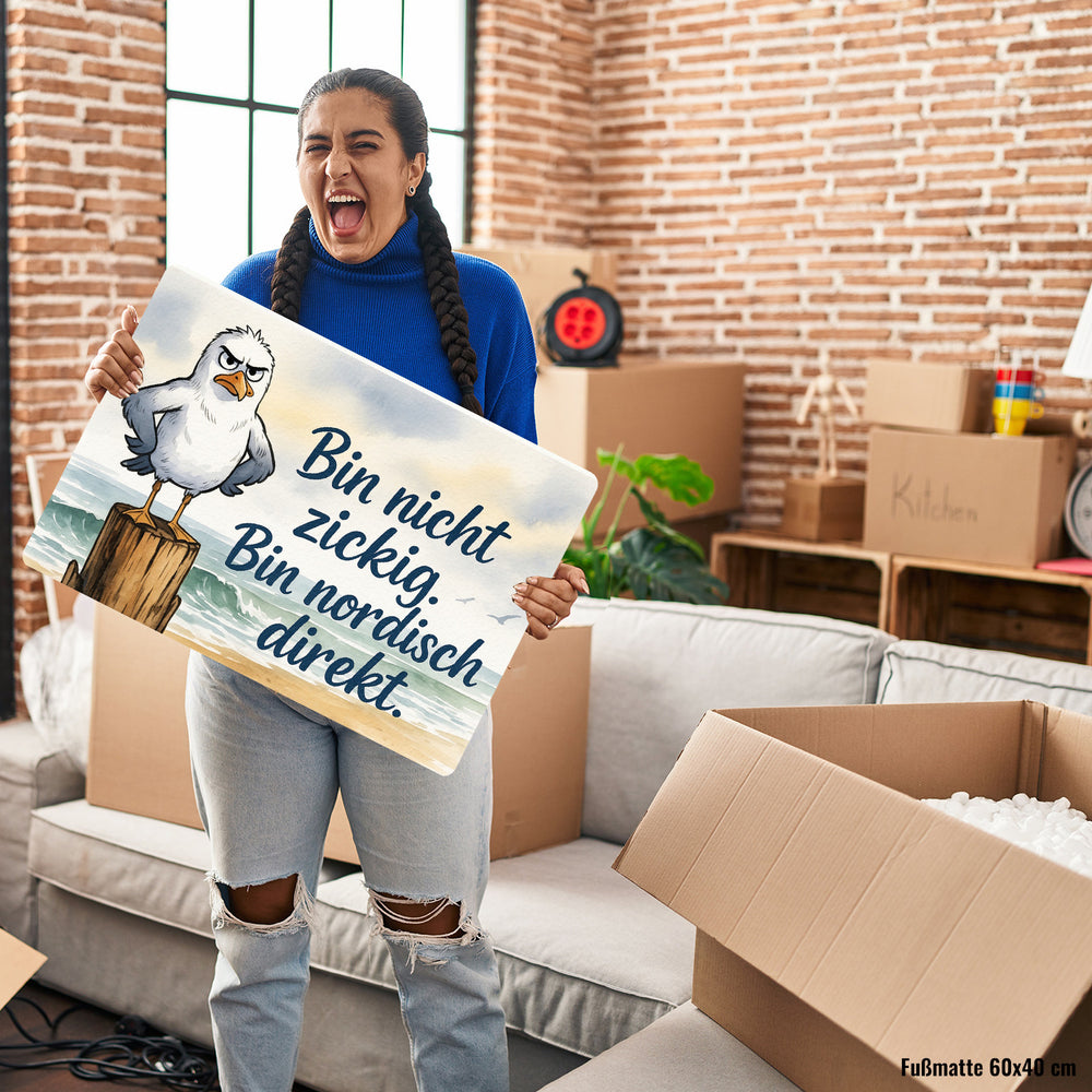 - Diese Fußmatte ist ein echter Hingucker: Eine mürrische Möwe thront auf einem Holzpfosten am Strand. Mit grauen Flügeln und einem orange-gelben Schnabel schaut sie unzufrieden drein. Der marineblaue Spruch "Bin nicht zickig. Bin nordisch direkt." sorgt für Schmunzeln. Ein Aquarell-Hintergrund mit Strand und Ozean vollendet den nordischen Look.