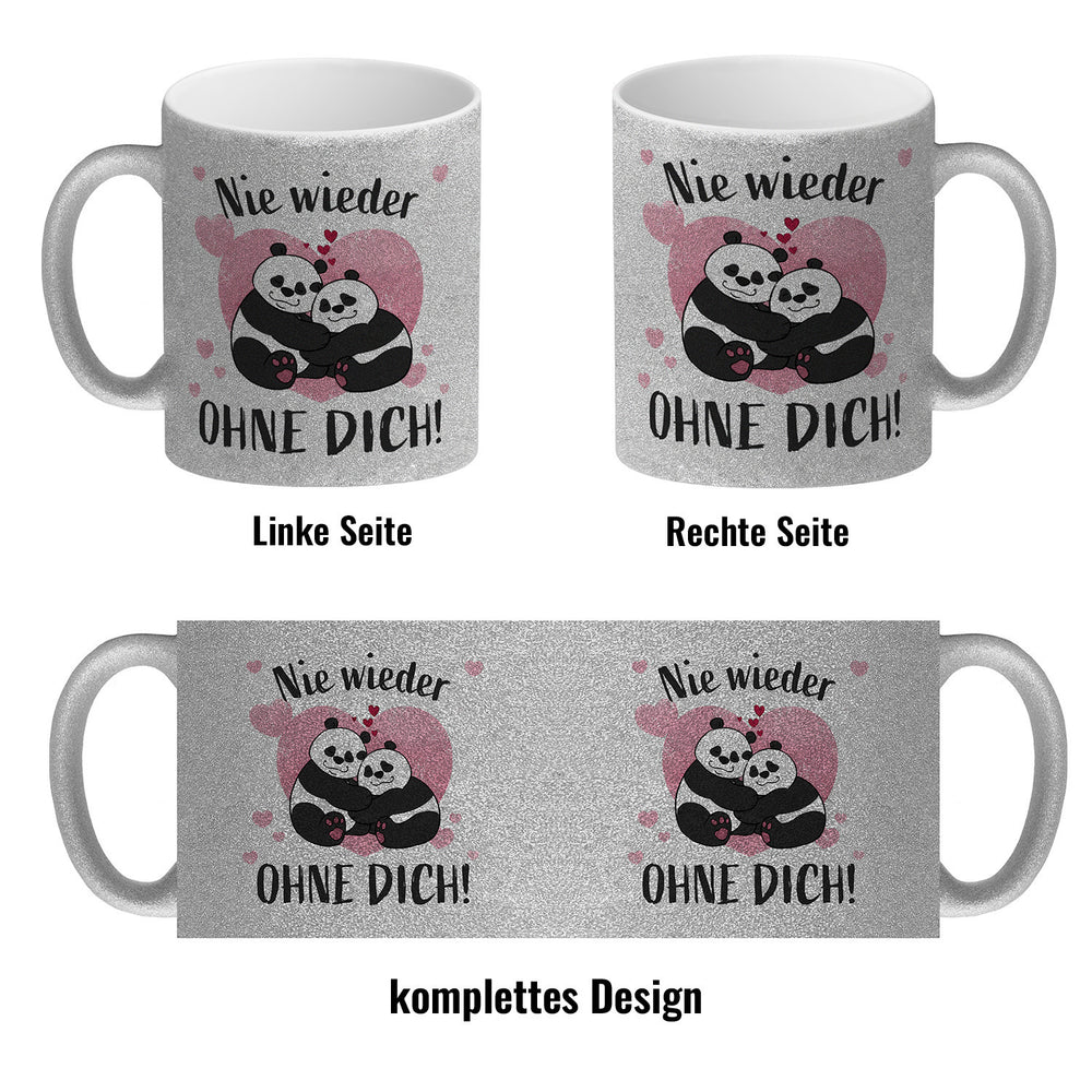 Zeige deine Liebe mit diesem Panda Pärchen Kaffeebecher! Das Motiv Nie wieder ohne dich ist eine schöne und romantische Erklärung für deinen Partner. Der Kaffeebecher ist handgefertigt in unserer Manufaktur in Deutschland und erhältlich in verschiedenen Varianten - als Standardtasse, mit farbigem Henkel und Innenseite, als edle Glastasse oder in der exklusiven Silberedition mit Glitzereffekt. Für jede Gelegenheit der perfekte Geschenk für hoffnungslose Romantiker! Überrasche deinen Partner an Valentinstag, Jahrestag oder beim Date mit dieser einzigartigen Tasse und schenke ihm damit ein Symbol der Liebe.