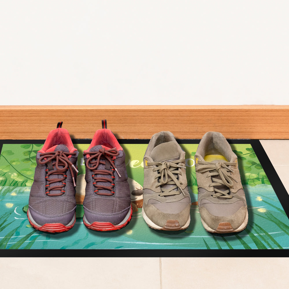 - Unsere niedliche Fußmatte zeigt einen verträumten Otter, der auf einem Seerosenblatt schläft. Mit ihrem natürlichen Design bringt sie einen Hauch von Teich-Idylle direkt vor Ihre Haustür. Fußmatten sind unverzichtbar, um die Wohnung sauber zu halten und Gäste herzlich zu begrüßen.