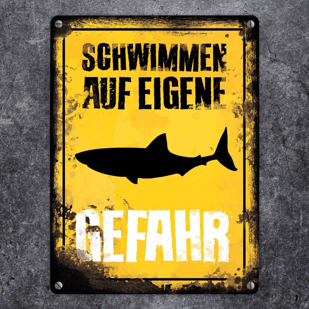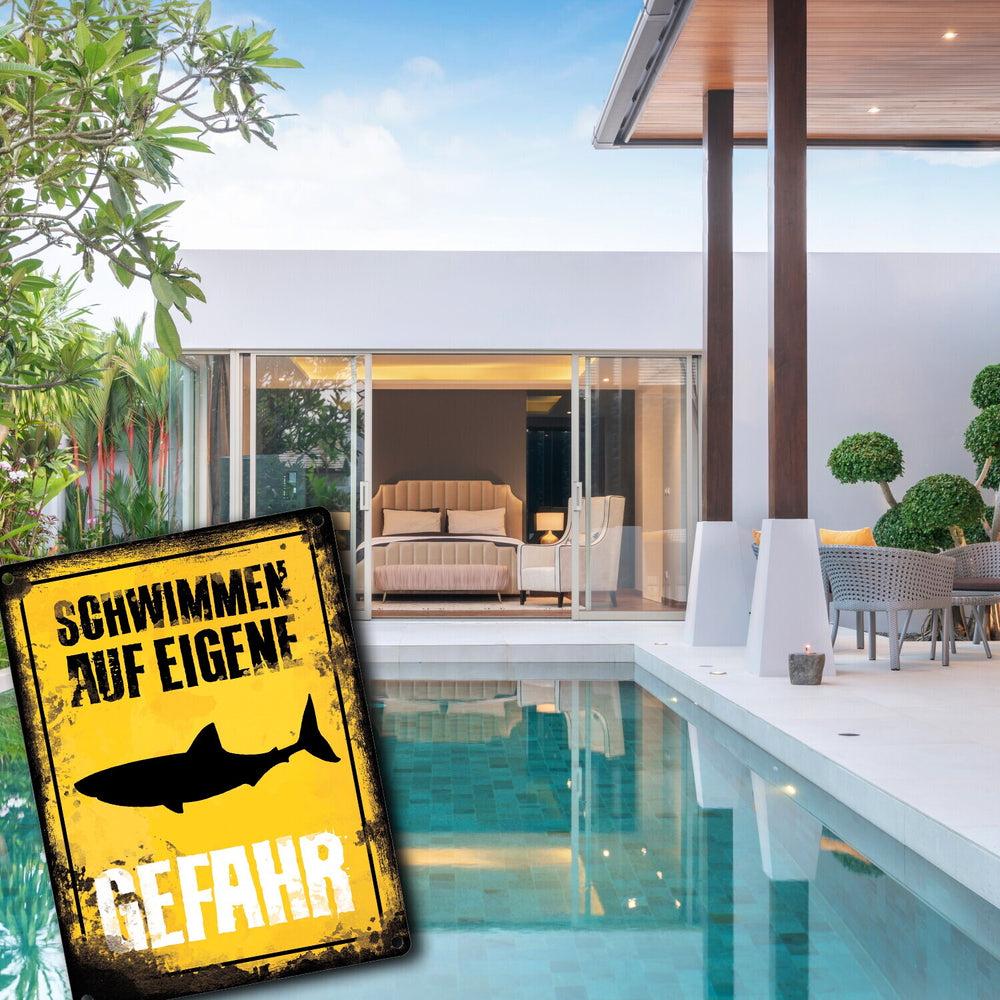Schwimmen auf eigene Gefahr Metallschild für den Pool mit Hai