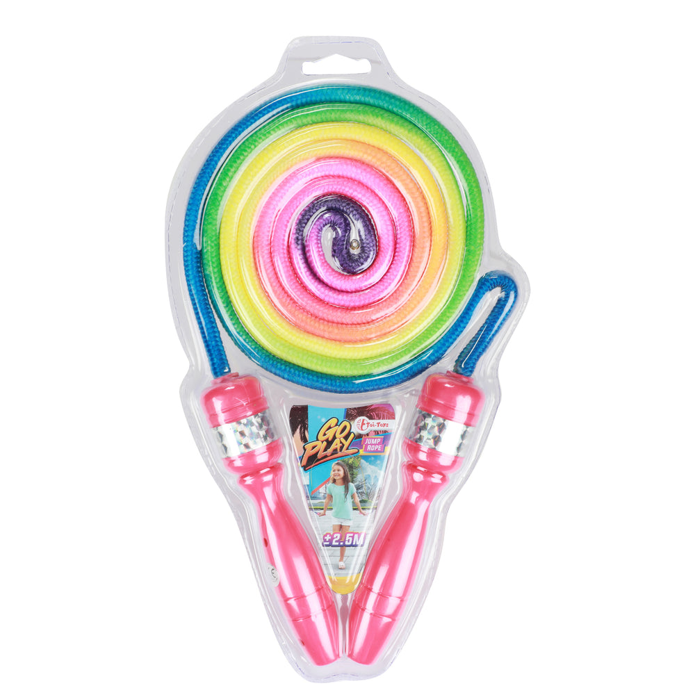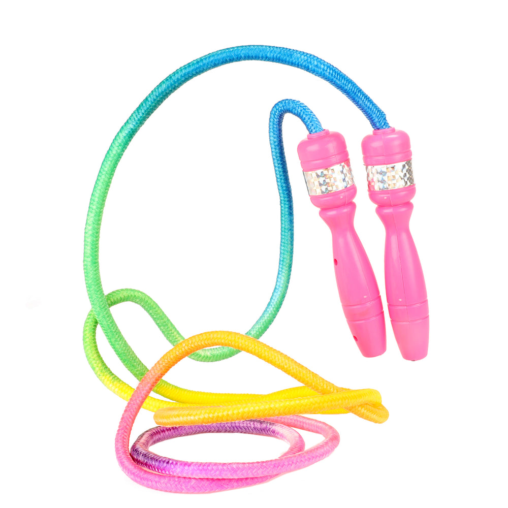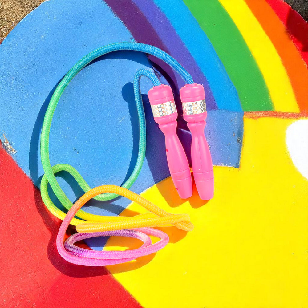 - Tauche ein in ein Meer aus Farben mit der regenbogenfarbenen Sprungschnur! Die pinken Griffe aus Kunststoff mit glitzernden Silberaufklebern verleihen dem Rainbow Sprungseil den letzten Schliff. Mit einer Länge von ca. 2,5 m ist es perfekt für kleine und große Springer geeignet.
