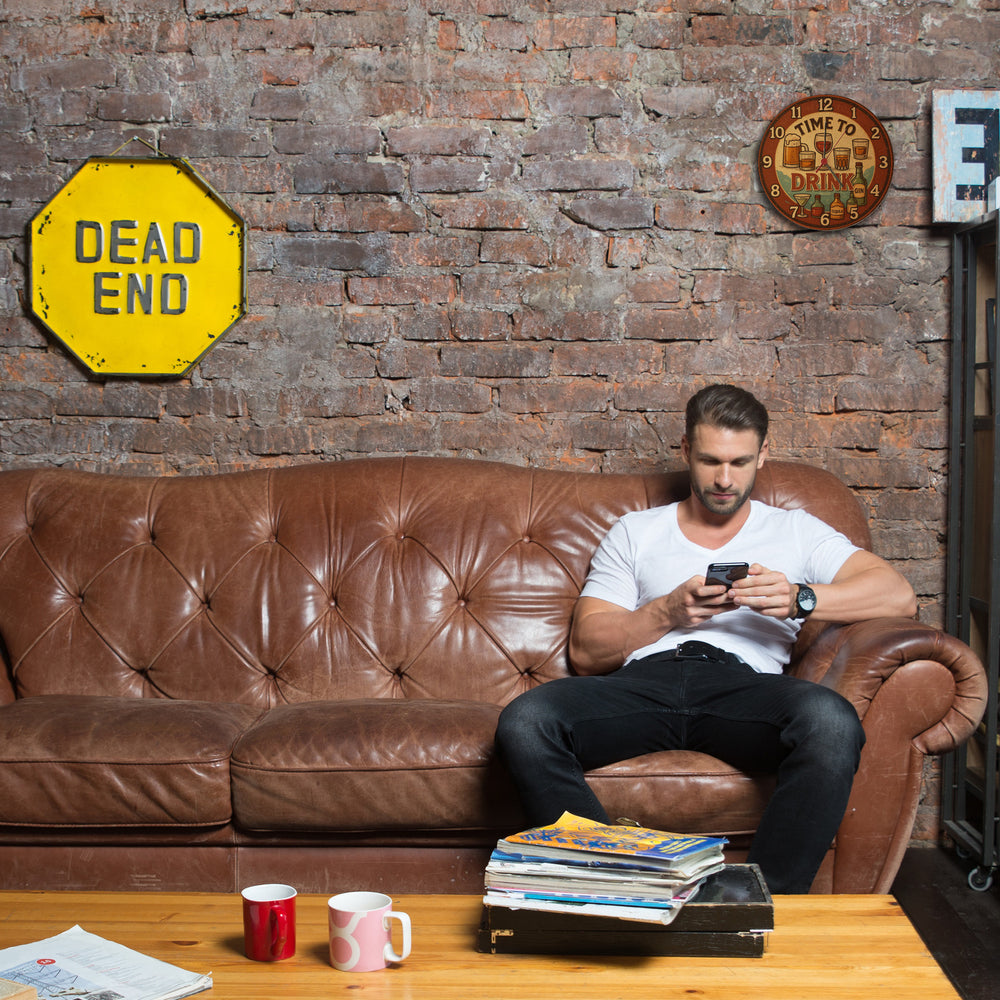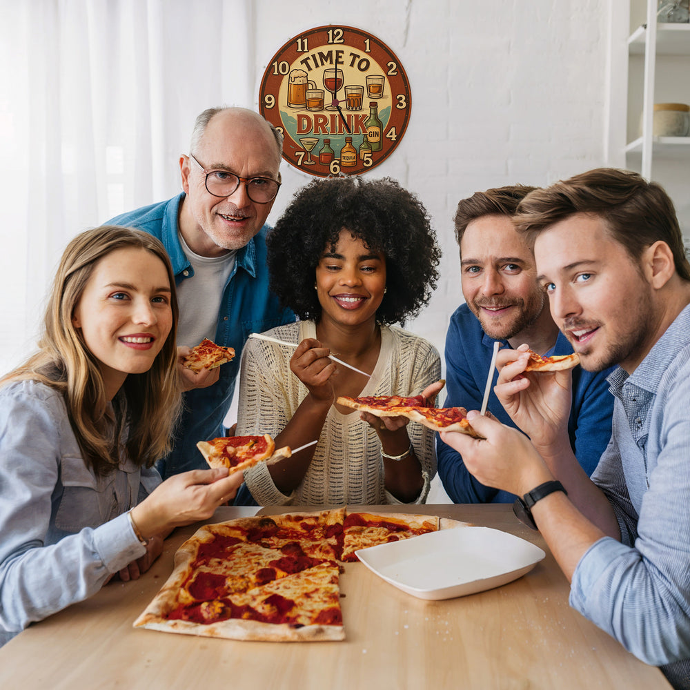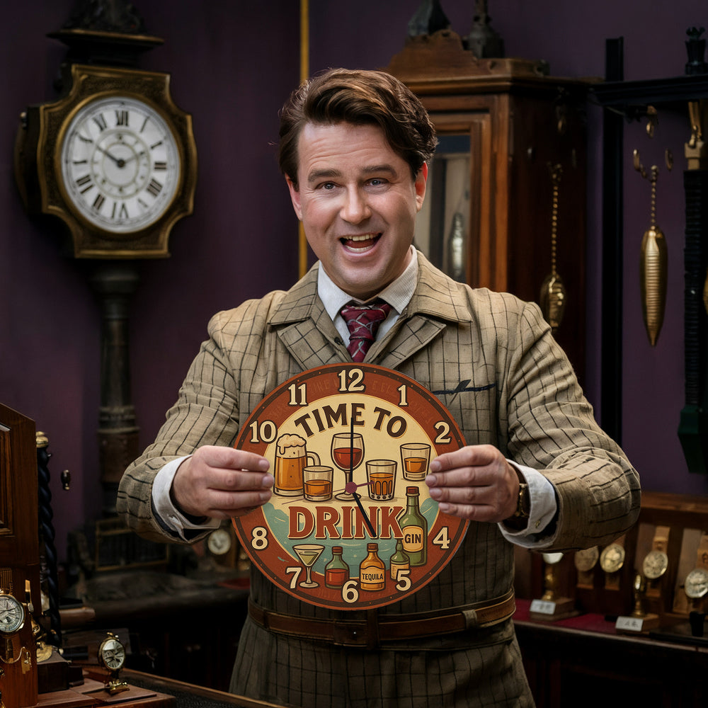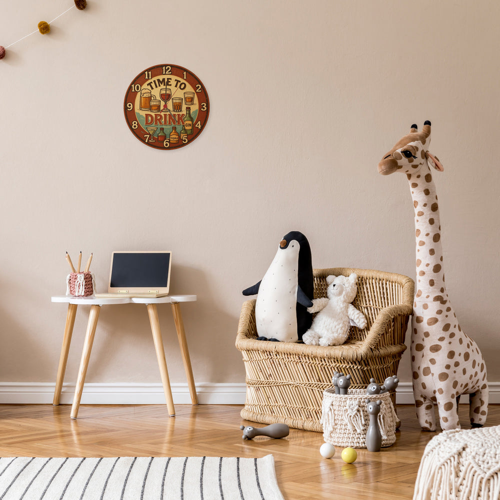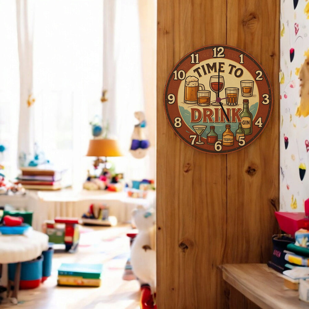 - Die "Time to Drink" Vintage Wanduhr besticht mit ihrem charmanten Retro-Design. Die runde Uhr präsentiert Illustrationen von Bierkrug, Weinglas, Martini- und Gin-Flasche. In warmen Braun- und Bernsteintönen gehalten, versprüht sie mit ihrem abgenutzten Look und den dekorativen Zeigern einen Hauch von Nostalgie.
