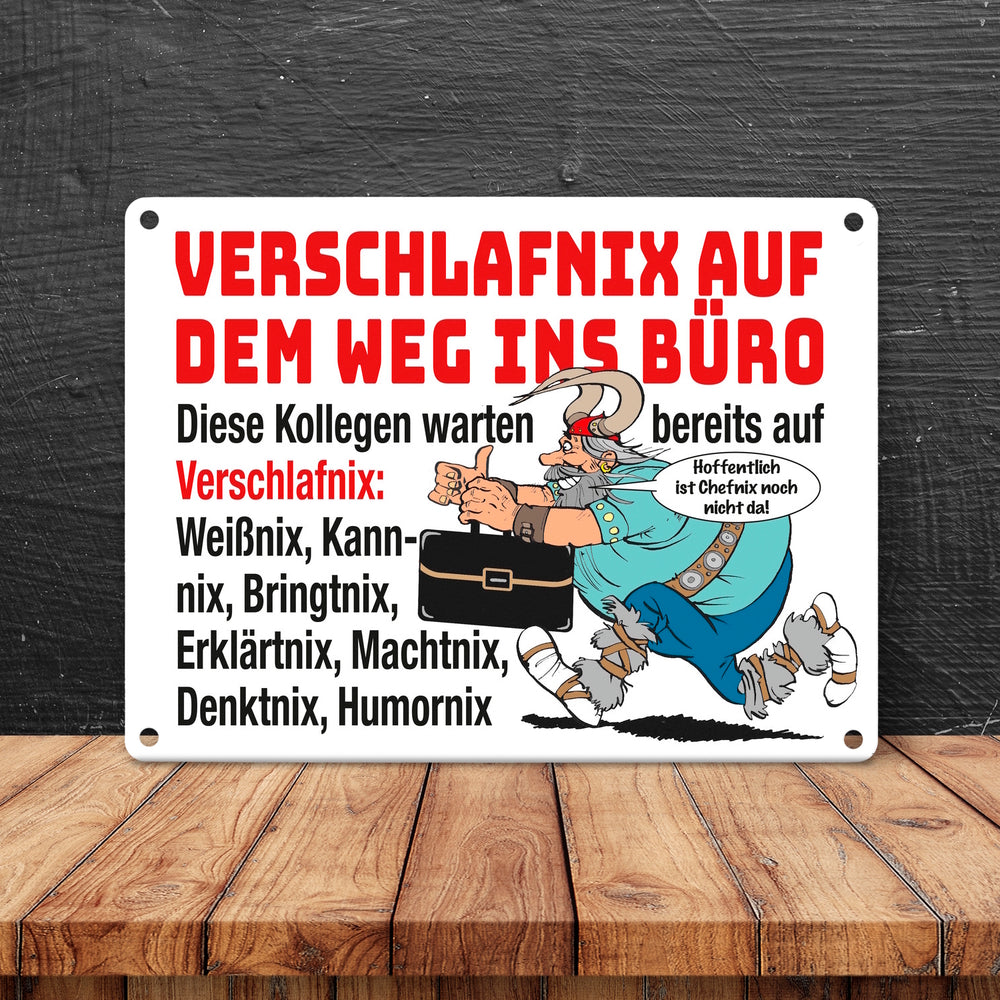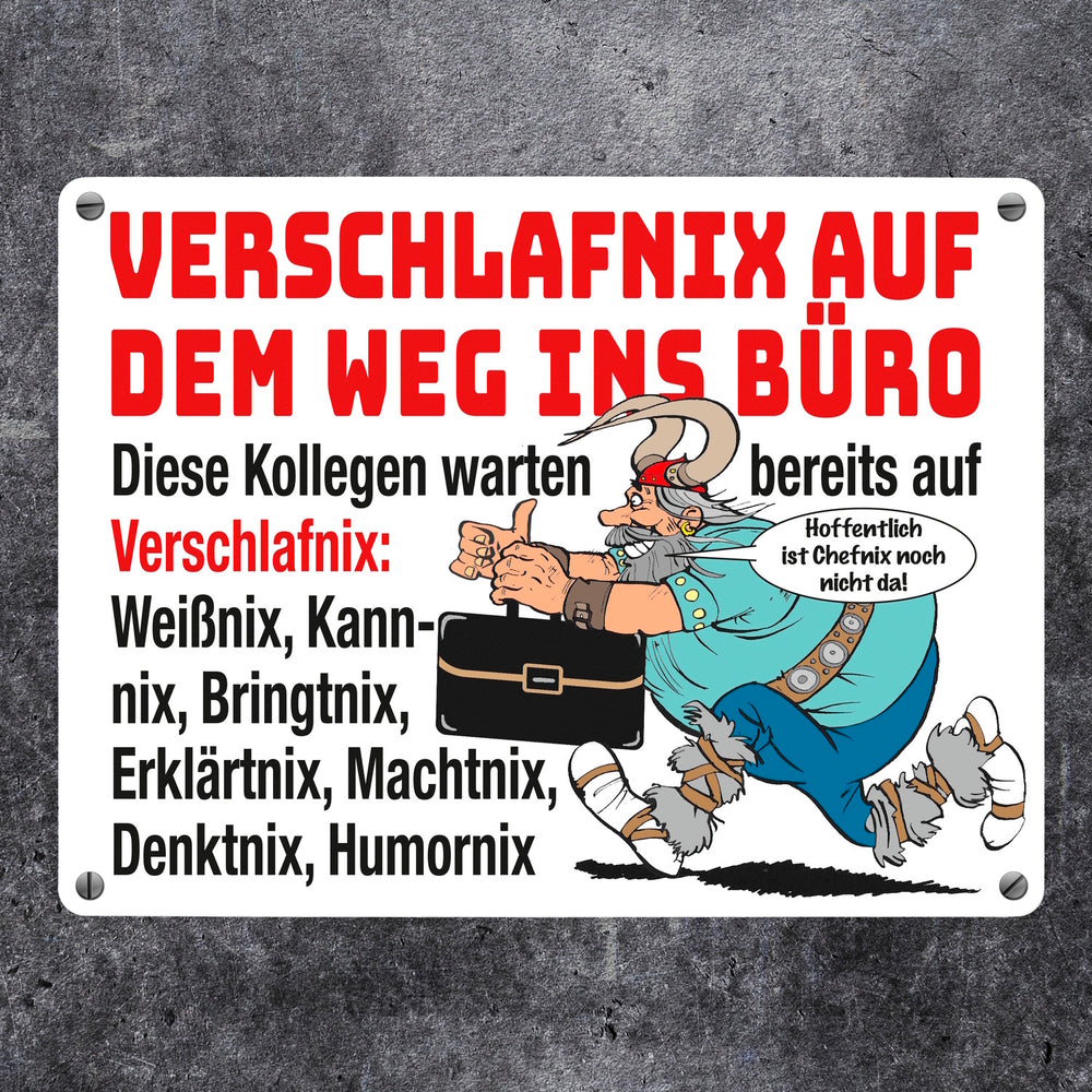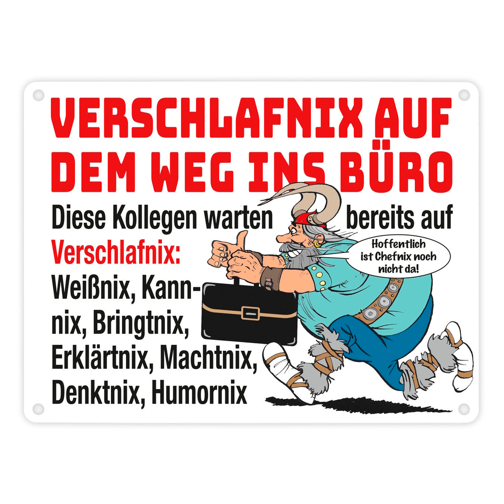 - Das Metallschild zeigt einen witzigen Cartoon eines gallischen Kriegers, der eine moderne Aktenmappe trägt. Der Spruch "Verschlafnix auf dem Weg ins Büro" stiehlt die Show. Umgeben von einem Team aus Weißnix, Kannnix und Co., bringt dieses Design humorvollen Schwung auf Ihren Schreibtisch oder ins Büro.