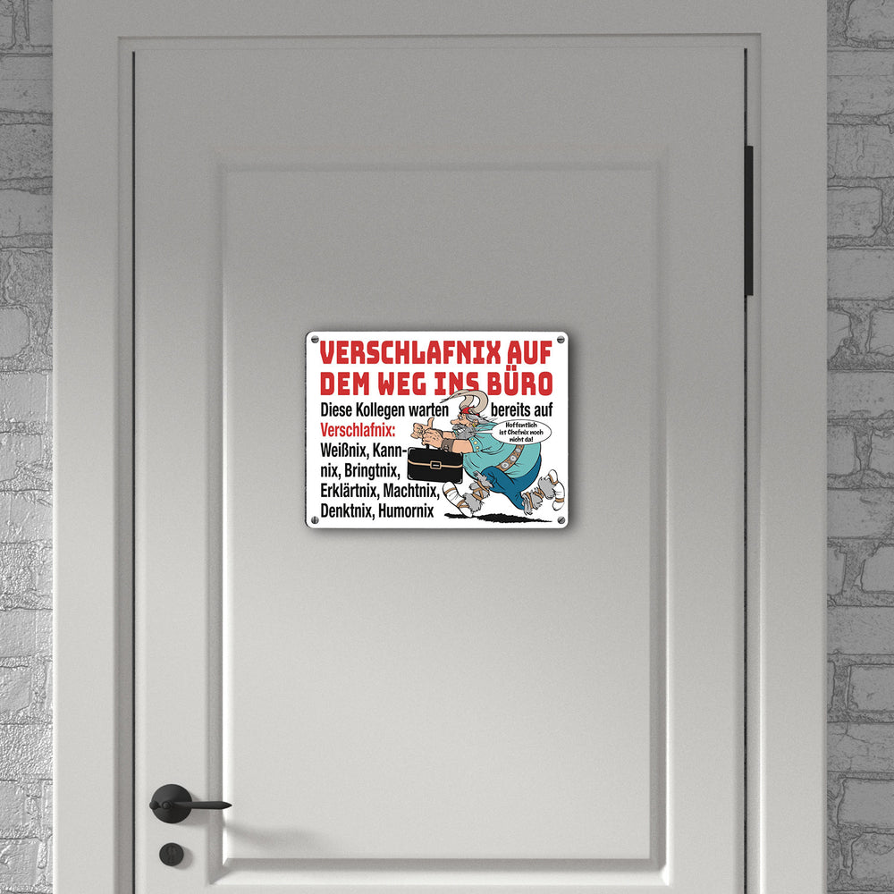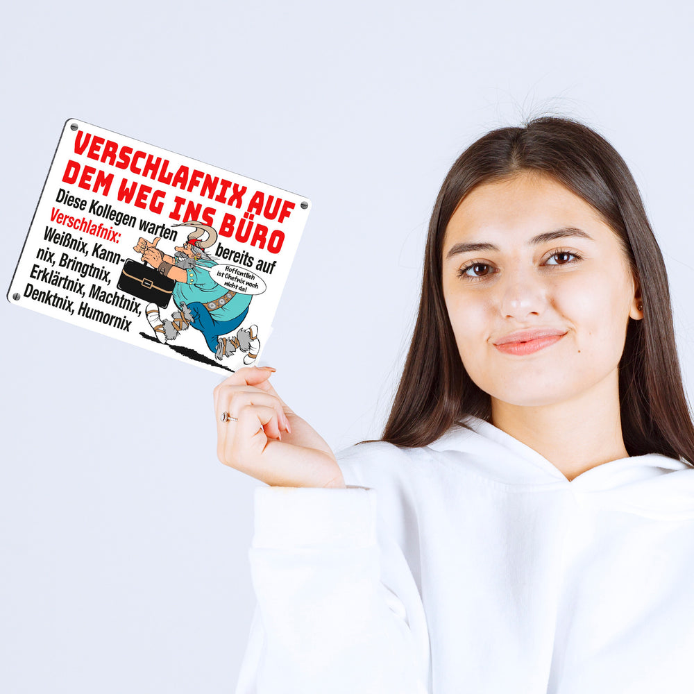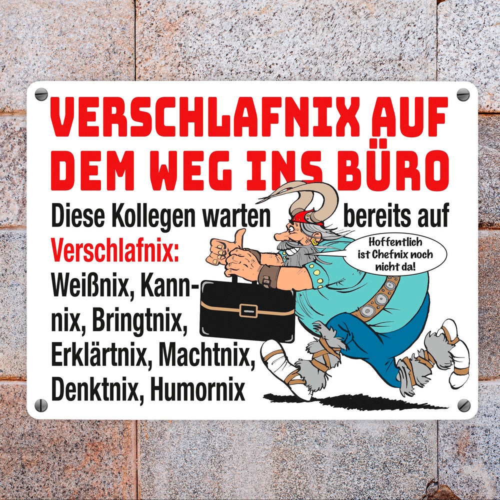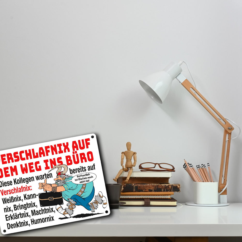 - Das Metallschild zeigt einen witzigen Cartoon eines gallischen Kriegers, der eine moderne Aktenmappe trägt. Der Spruch "Verschlafnix auf dem Weg ins Büro" stiehlt die Show. Umgeben von einem Team aus Weißnix, Kannnix und Co., bringt dieses Design humorvollen Schwung auf Ihren Schreibtisch oder ins Büro.