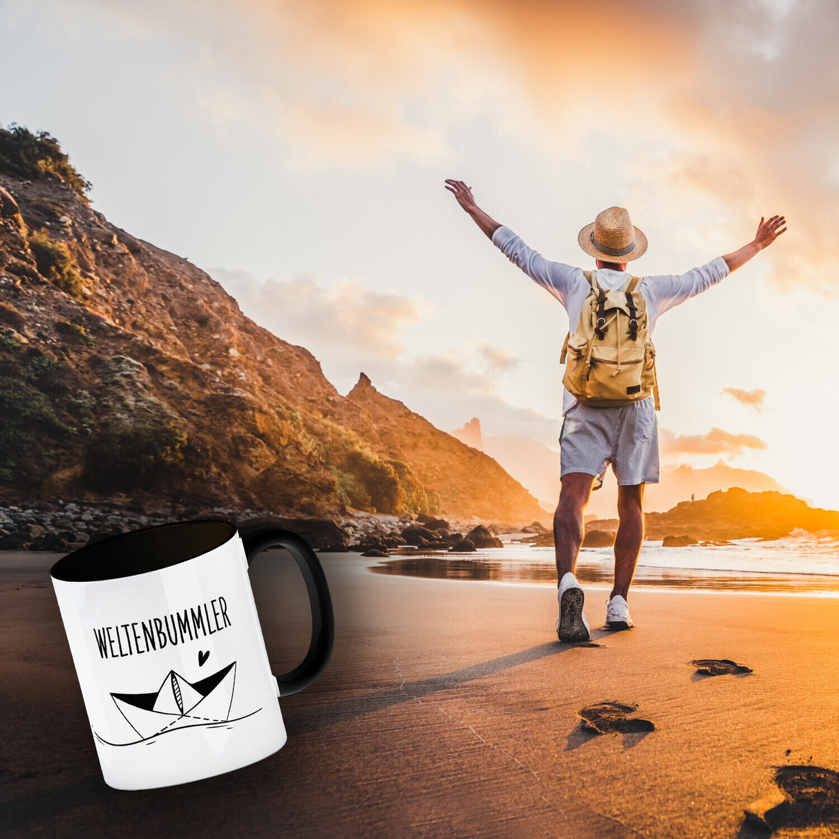 - 1x Weltenbummler Kaffeebecher mit schönem Papierschiff Motiv in der gewählten Ausführung