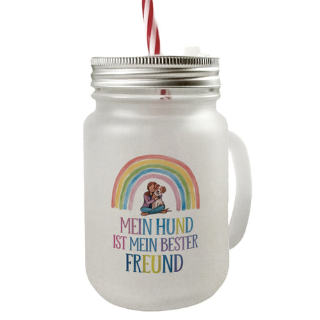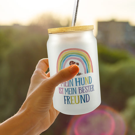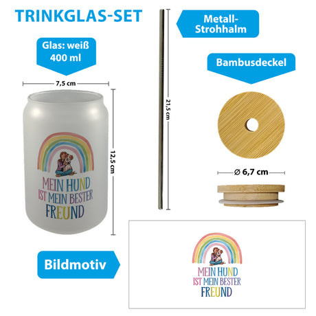 €9,95Grundpreis /Nicht verfügbarAuf LagerHund ist bester Freund Trinkglas mit Bambusdeckel Frau umarmt Hund unter Regenbogen