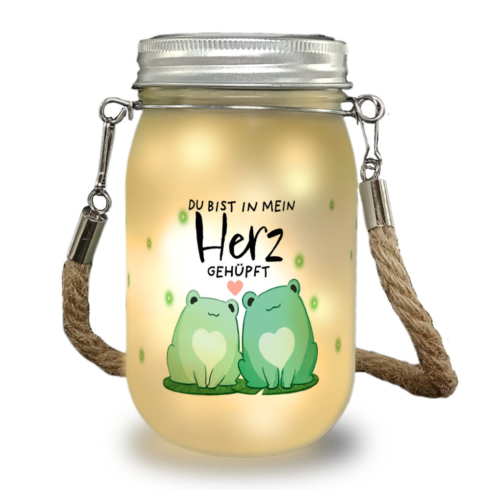 - Das kawaii Solarlicht ist ein süßes, niedliches Dekolicht in Form eines Einmachglases mit Solar Deckel und nostalgischem Strick als Henkel. Es zeigt ein verliebtes Frosch Paar, das sich kuschelig aneinander schmiegt. Perfekt für den Fenstersims, um eine gemütliche Atmosphäre zu schaffen.