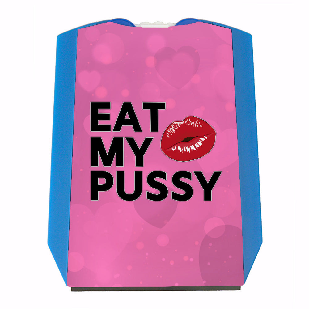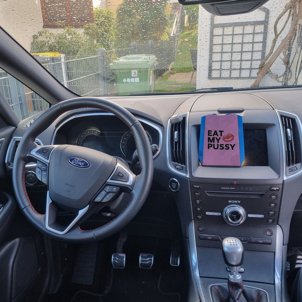 - Eat my PUSSY- Die Parkscheibe zeigt einen provokanten Spruch und einen roten Kussmund auf pinken Hintergrund.