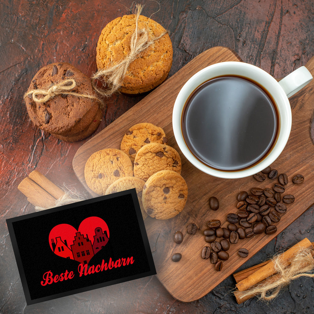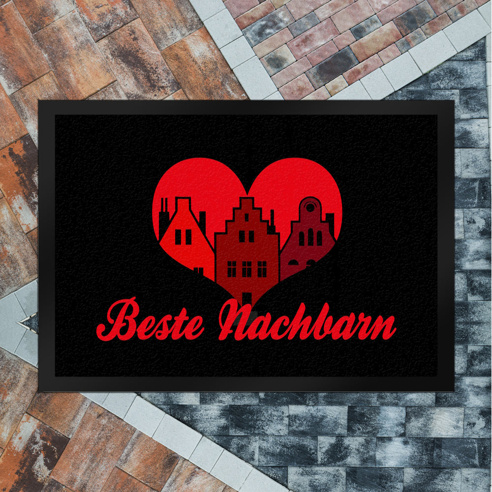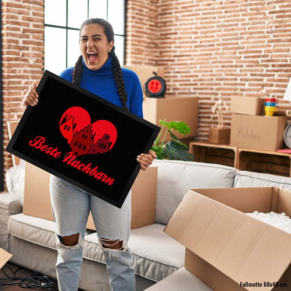 - Treten Sie ein ins Reich der Herzlichkeit – mit unserer "Beste Nachbarn" Fußmatte! Stolz präsentiert sie eine charmante Häuserfront, die sich gemütlich in einem Herz schmiegt. Für alle, die beim Heimkommen schon Liebe unter den Füßen spüren wollen!