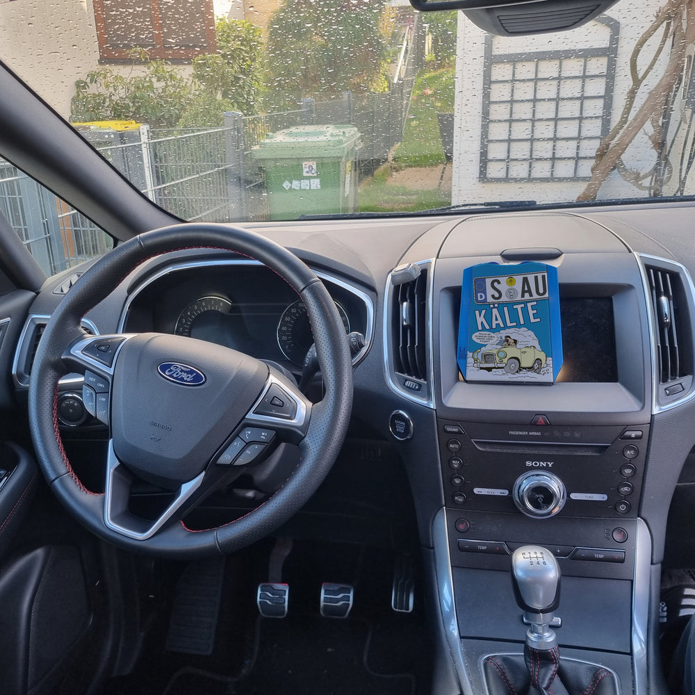 Boxauto als E-Auto Parkscheibe mit Spruch zu E-Mobilität in blau