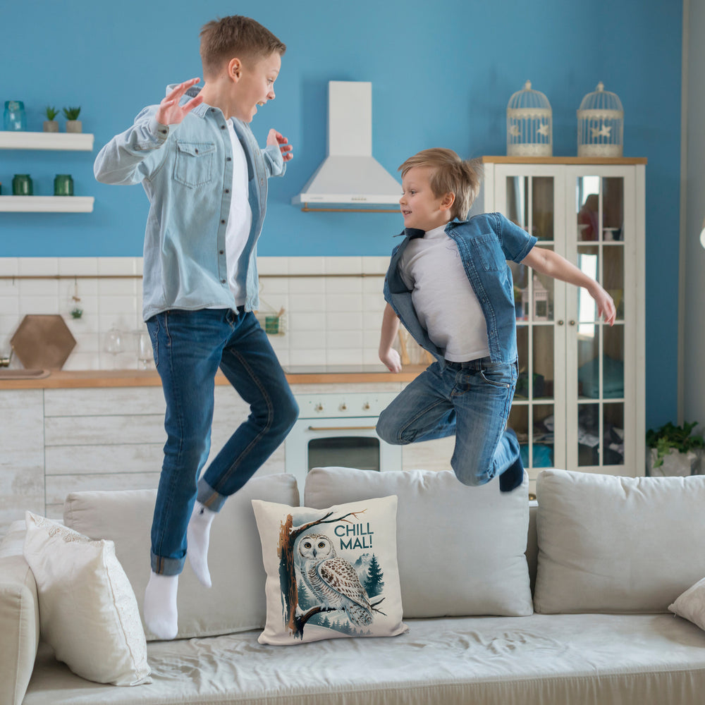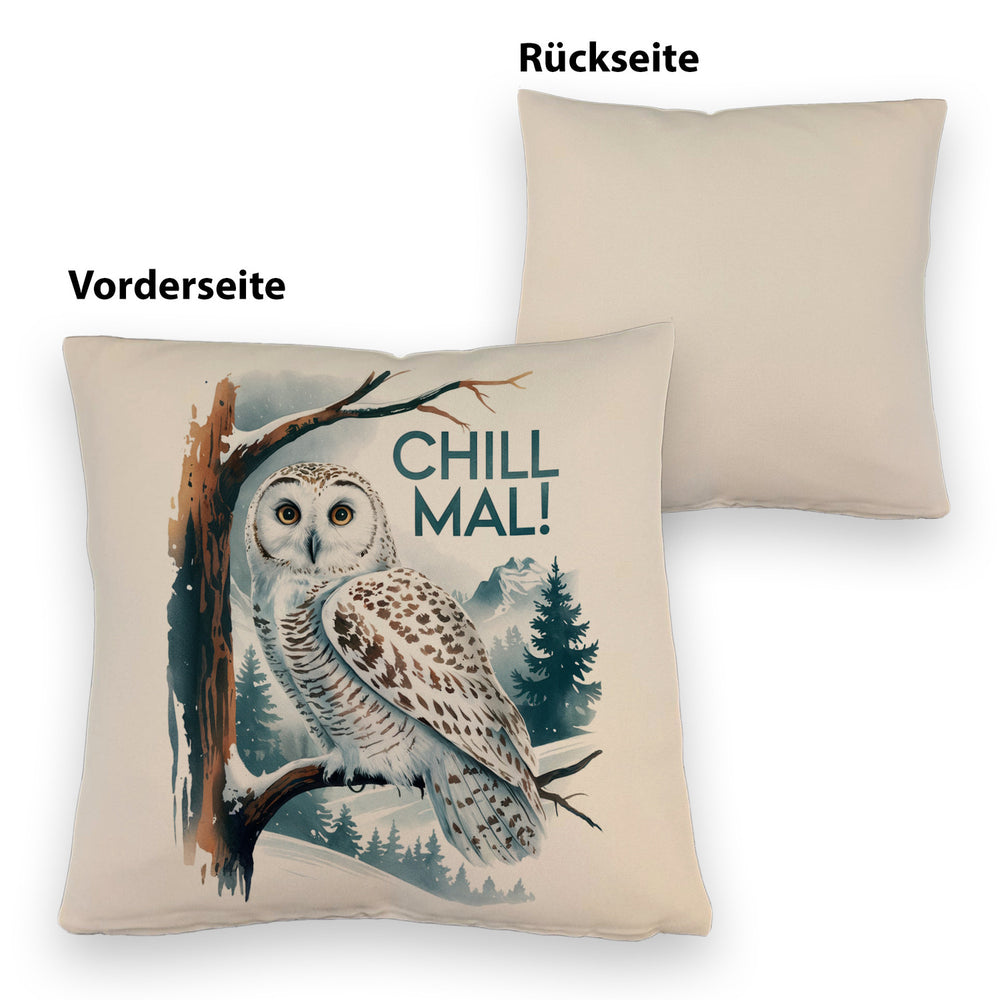 - Dieses lustige Kissen zeigt eine entspannte Schneeeule auf einem Ast in einer ruhigen Winterlandschaft. Die Eule hat weißes Gefieder mit braunen Flecken und auffallend gelbe Augen. Mit dem humorvollen Spruch "CHILL MAL!" in Aquarell-Pastellfarben bringt es Spaß in jedes Zimmer.