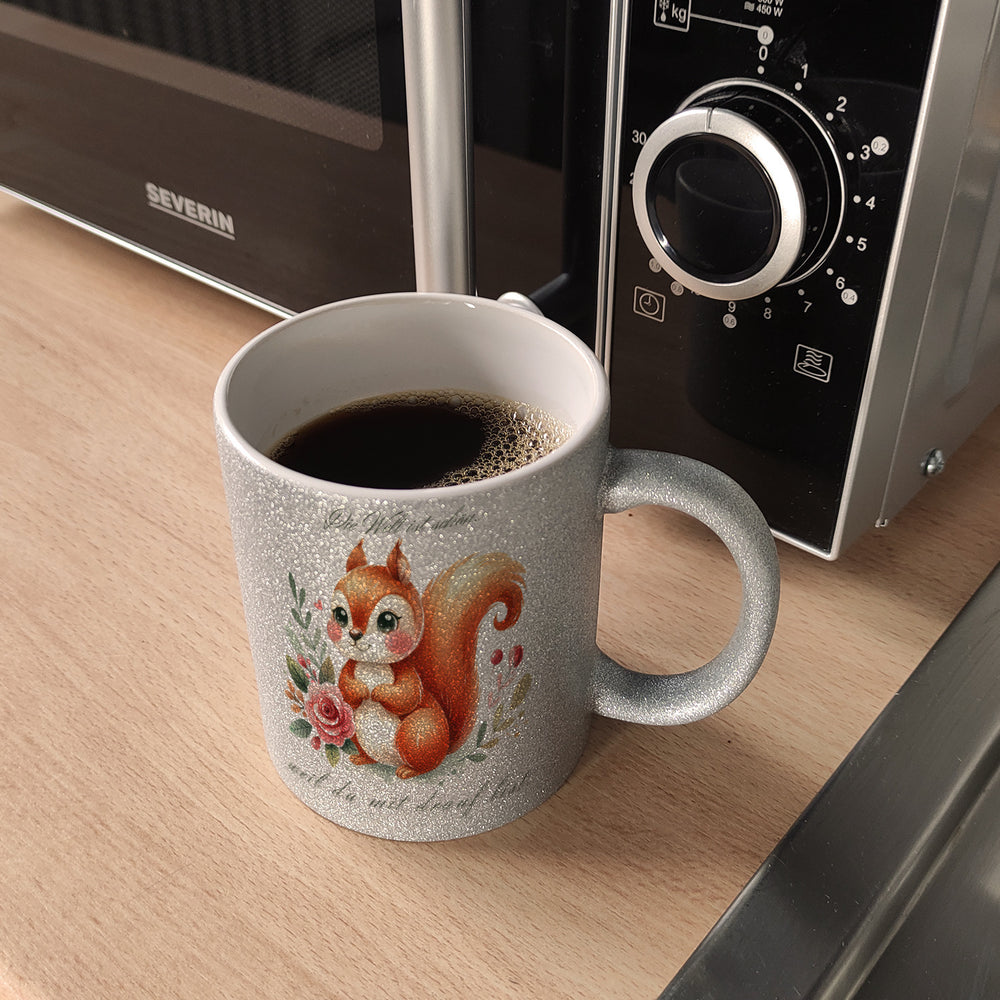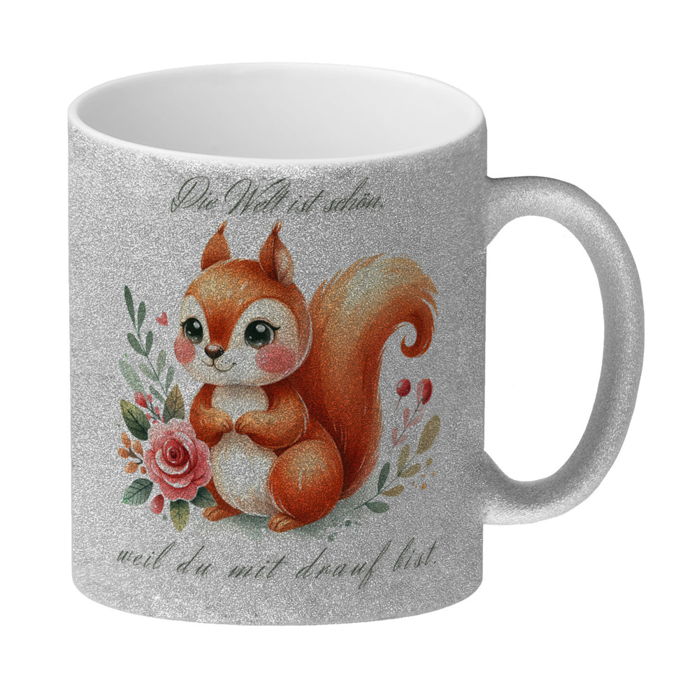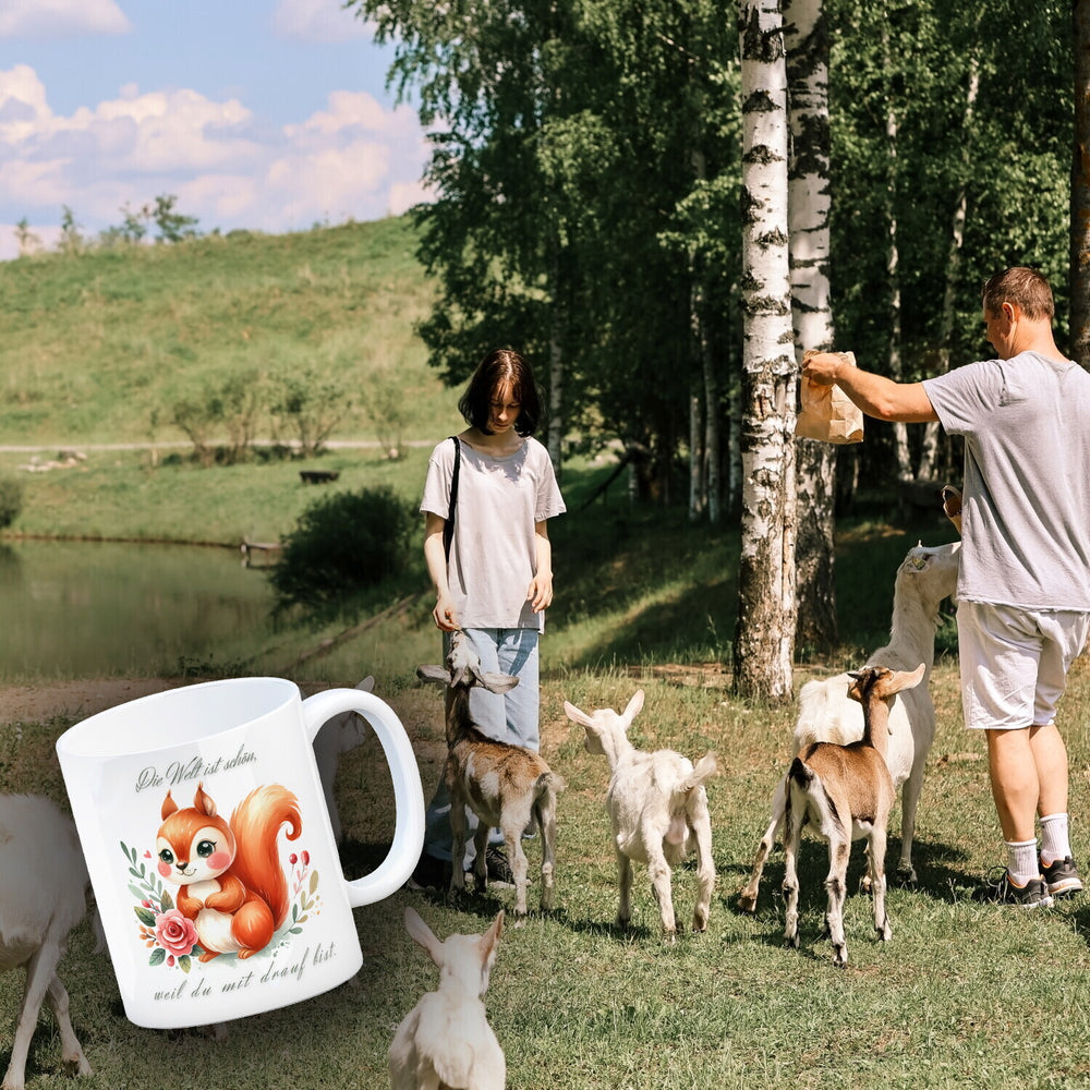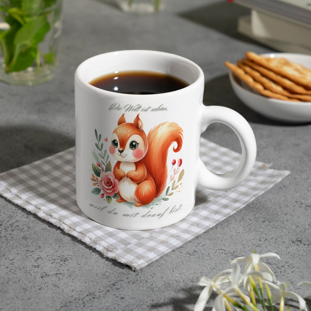 - 1x Eichhörnchen Kaffeebecher mit Spruch Welt schön da du dabei in der gewählten Ausführung