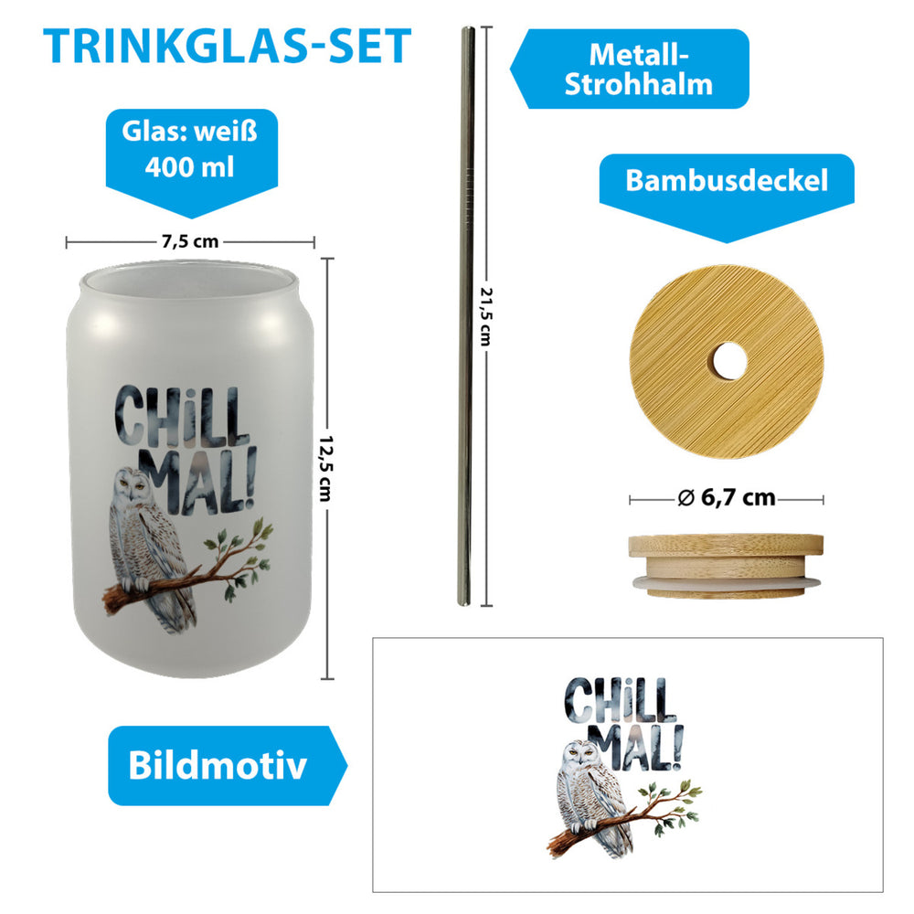- 1x Entspannte Schneeeule Chill mal Trinkglas mit Bambusdeckel mit Bambusdeckel oder Henkel