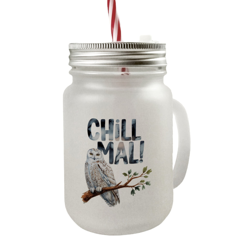 - Dieses Trinkglas besticht durch ein einzigartiges Design auf weißem Hintergrund. In pastellfarbenem Aquarellstil prangt der deutsche Spruch "CHILL MAL!" in großen, fetten Buchstaben. Darunter ruht eine entspannte Schneeeule auf einem Ast, beeindruckend mit scharfem Blick und stilvollen Farben. Ein perfektes Accessoire für dein Zuhause!