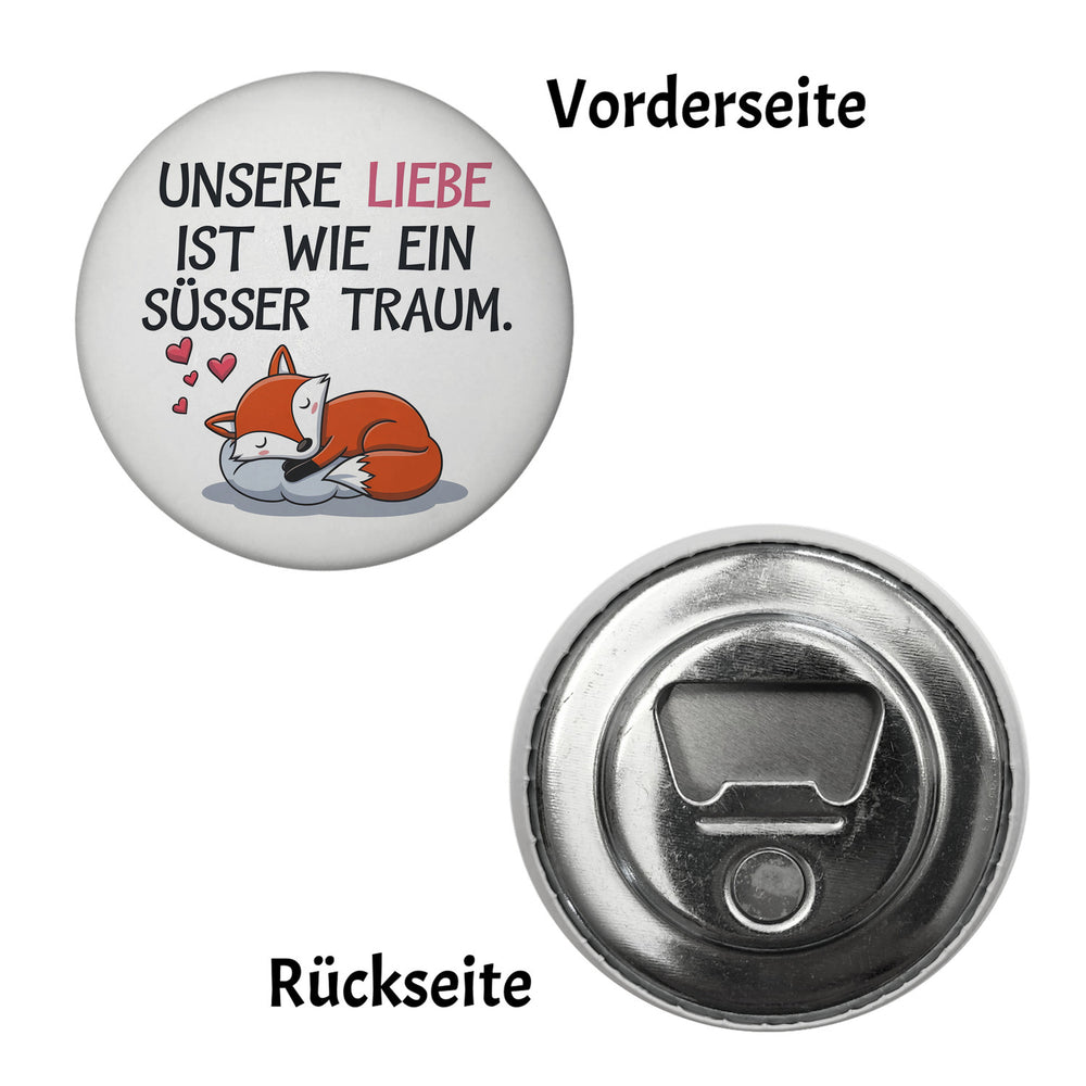 - Der Fuchs Magnet zum Valentinstag ist ein charmanter, runder Magnet mit einer schlafenden Füchsin auf einer Wolke. Diese süße Cartoon-Illustration zeigt den Schriftzug "Unsere Liebe ist wie ein süßer Traum" umrahmt von kleinen Herzsymbolen auf einem weißen Hintergrund. Lebendige Farben heben die Füchsin und den Text hervor.