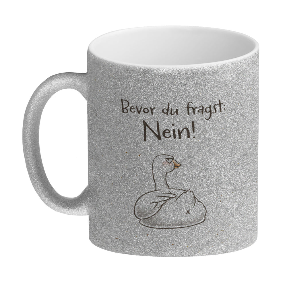 Verleihen Sie Ihren Kaffee-Momenten ein bisschen Spaß und Humor mit dem Gilbert die Gans Kaffeebecher mit Spruch Bevor du fragst Nein. Dieser Becher ist ideal für alle, die gerne lachen und den Tag mit einem Schmunzeln beginnen möchten. Mit seinem auffälligen und humorvollen Design bringt er jeden Morgenmuffel zum Schmunzeln. Erhältlich in verschiedenen Varianten - als weiße Standardtasse, mit farbigem Henkel und Innenseite, als edle Glastasse oder in der exklusiven Silberedition mit Glitzereffekt. Dieser Kaffeebecher ist ein unverzichtbares Accessoire für jeden Kaffeeliebhaber und Comic-Fan. Er sorgt dafür, dass Ihre Kaffeepause nie langweilig wird und macht sie zu einem unvergesslichen Moment. Verleihen Sie Ihrem Alltag mehr Spaß und Fröhlichkeit - holen Sie sich jetzt den Gilbert die Gans Kaffeebecher!