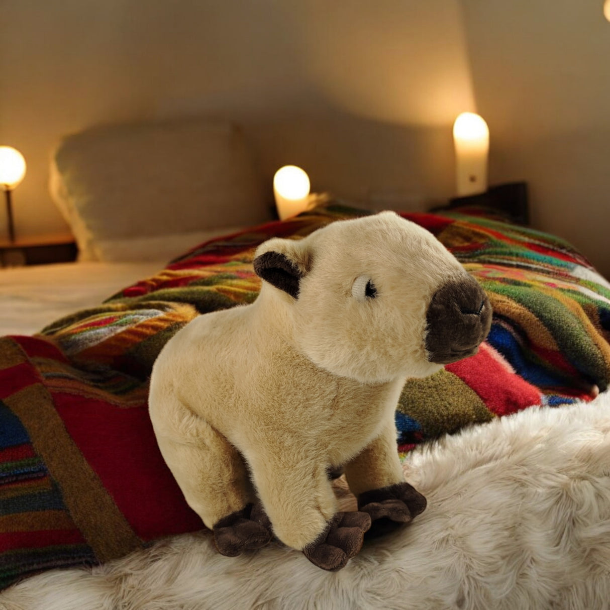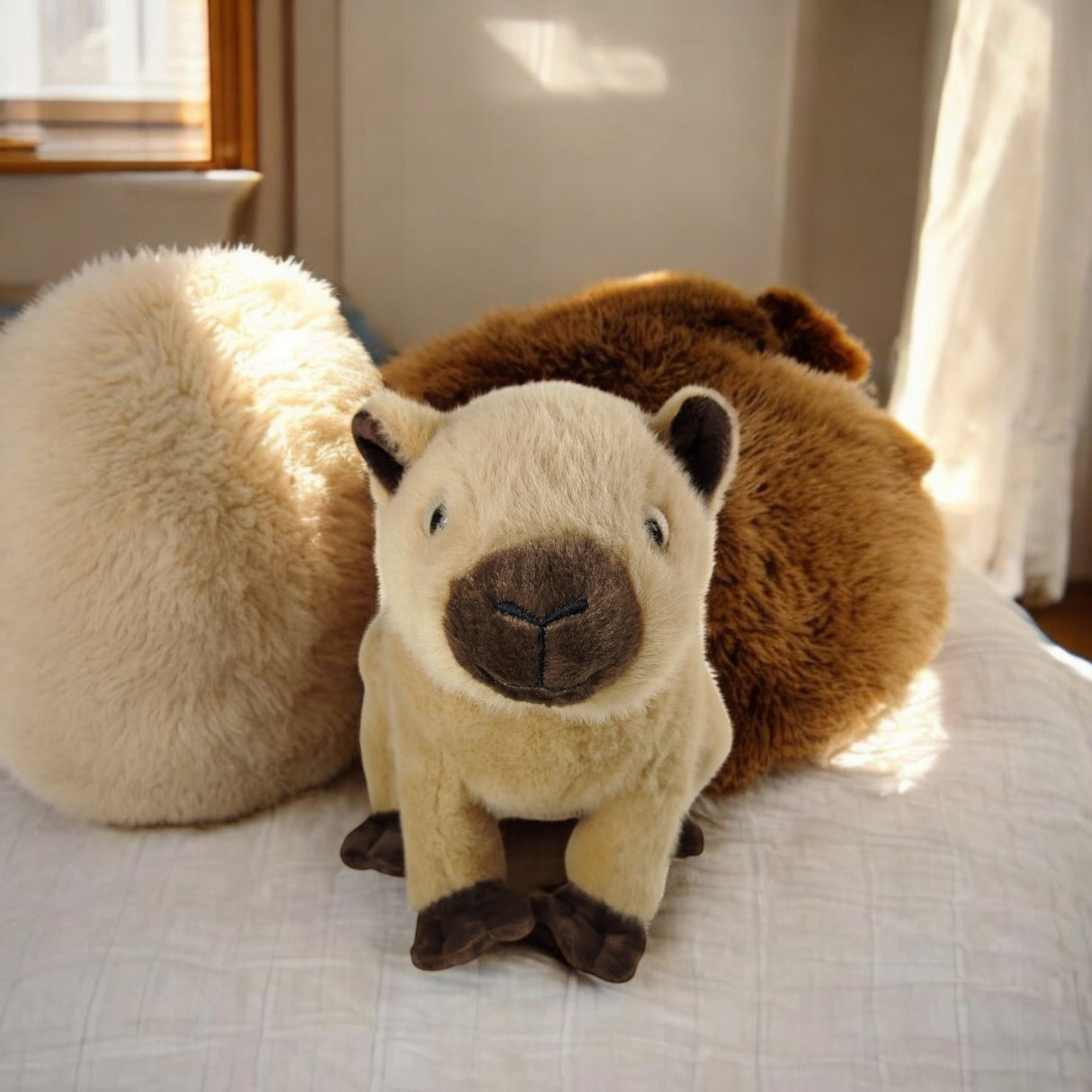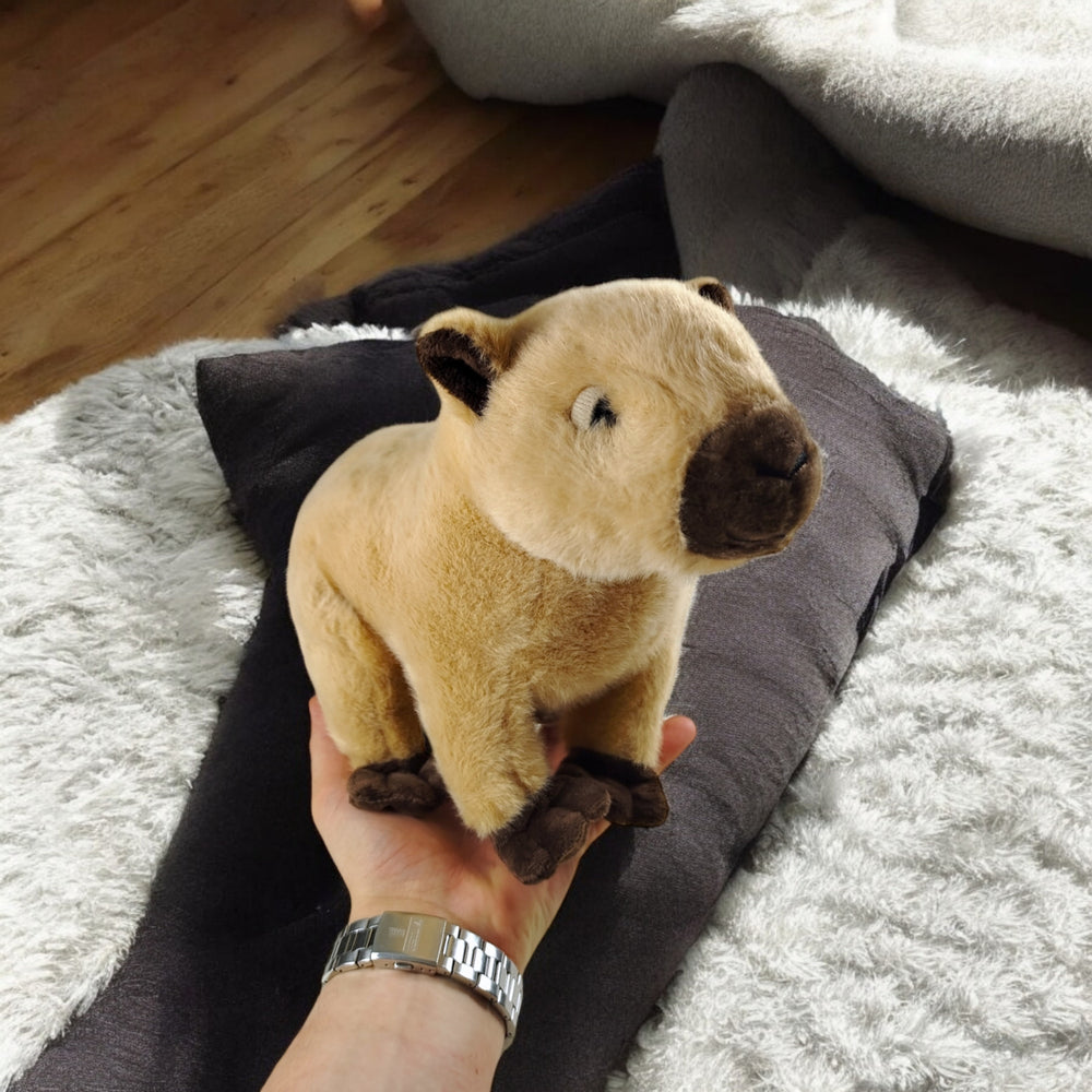 - Das Capybara Kuscheltier überzeugt durch sein detailreiches Design: hellbraunes, flauschiges Fell und dunkle Pfoten. Mit seinen Kunststoffaugen in passendem Braun strahlt es eine liebevolle Ruhe aus. Super weich und perfekt für das Bett geeignet, macht es jede Kuschelnacht zu einem entspannten Erlebnis.