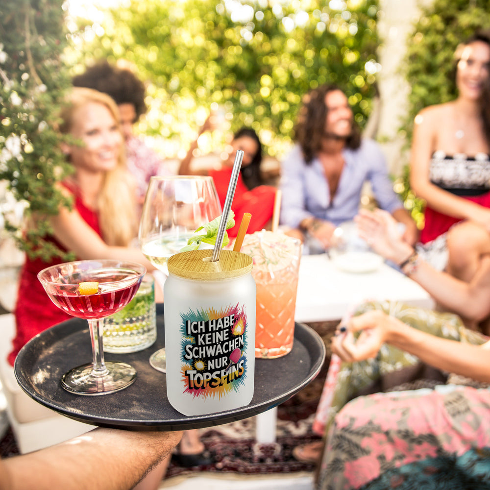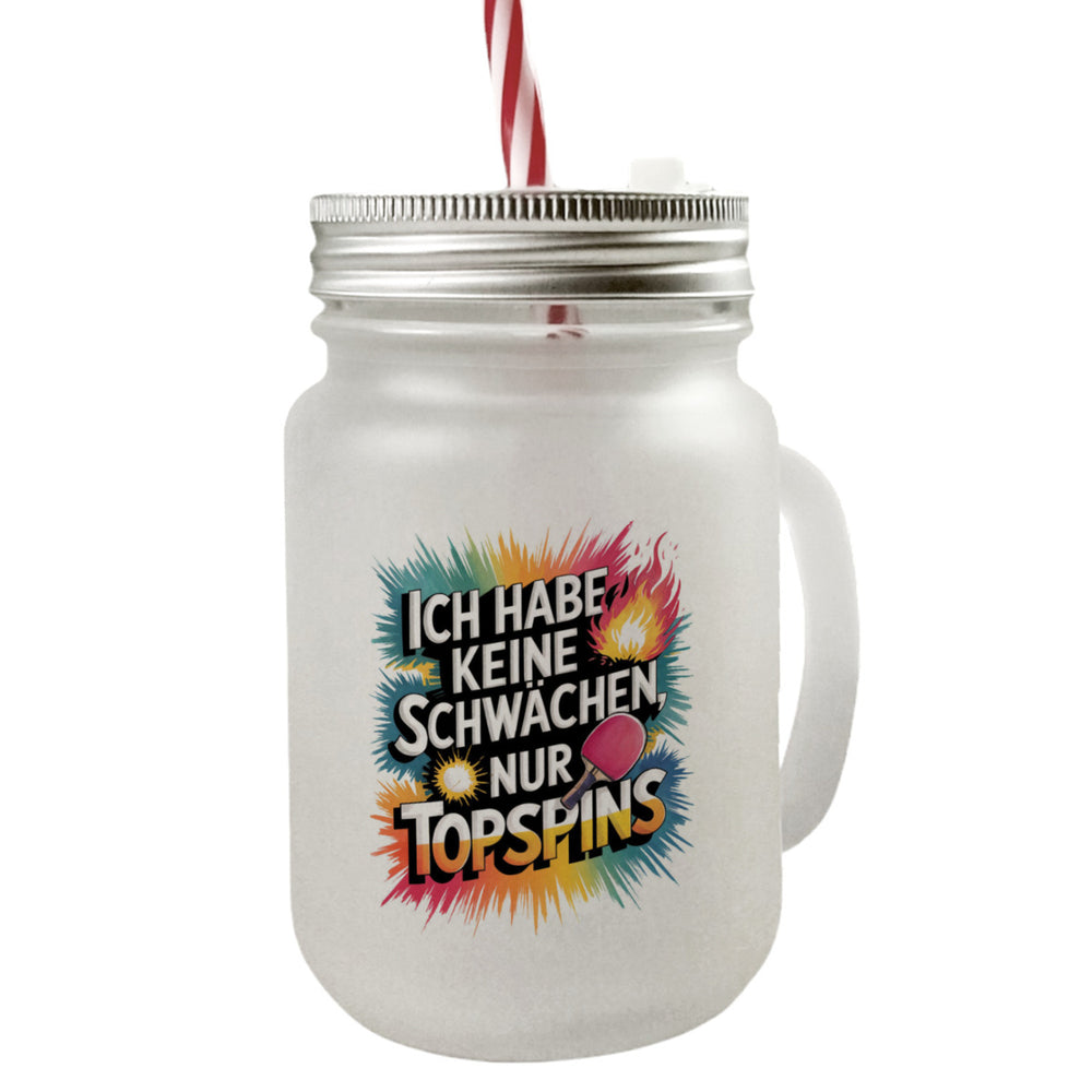 - Dieses humorvolle Trinkglas besticht durch ein kraftvolles und farbenfrohes Design. Der Spruch "ICH HABE KEINE SCHWÄCHEN, NUR TOPSPINS" leuchtet in großen, mehrfarbigen Buchstaben auf einem weißen Hintergrund. Dynamische Farbausbrüche in Blau, Gelb, Rot und Grün umrahmen die Aussage. Neben dem Spruch sind ein Tischtennisschläger und Ball dargestellt.