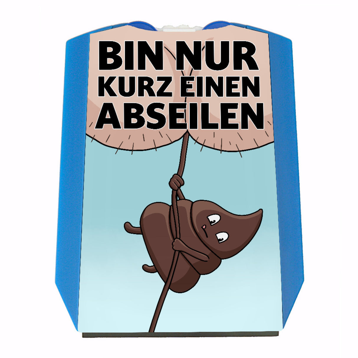 • Auf der Parkscheibe ist ein Hintern abgebildet, aus dem sich gerade ein Stück Scheiße abseilt. Der Spruch lautet: Bin nur kurz einen abseilen.