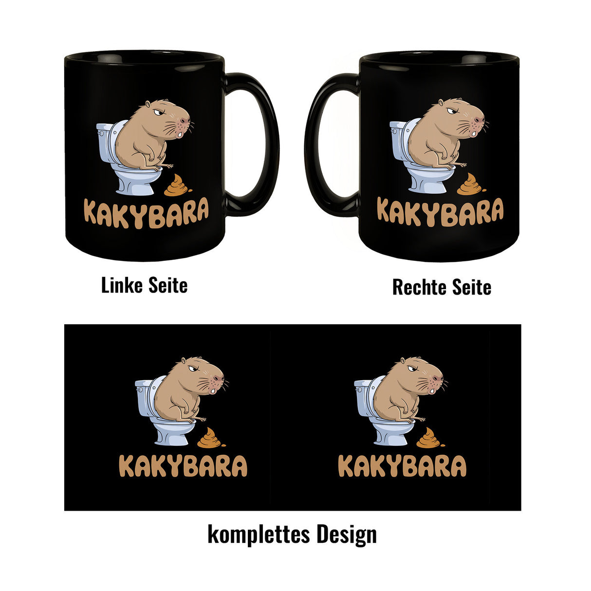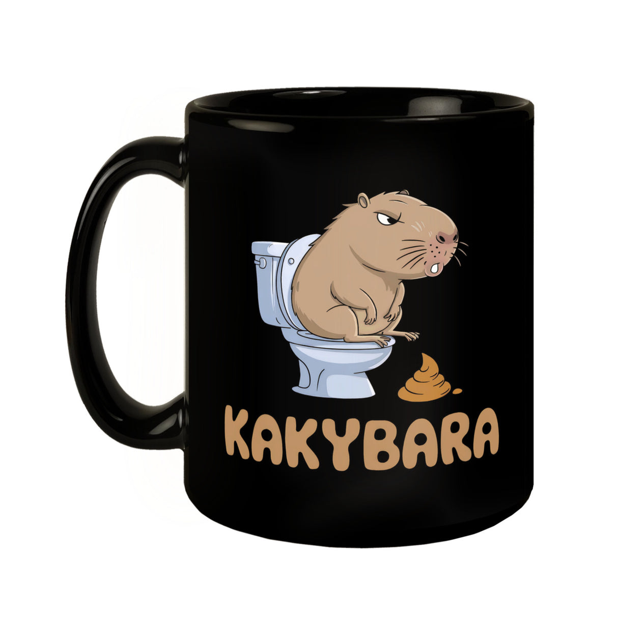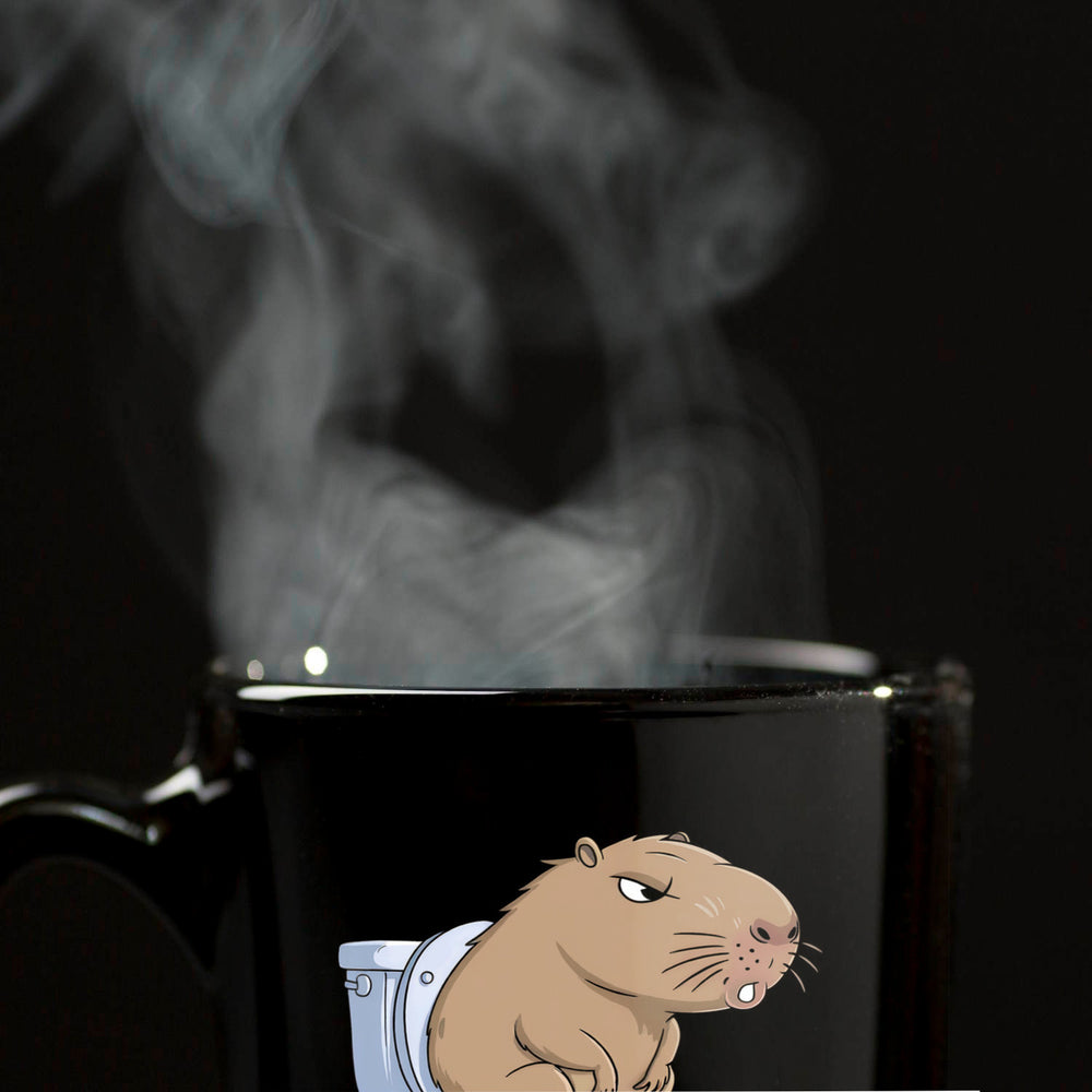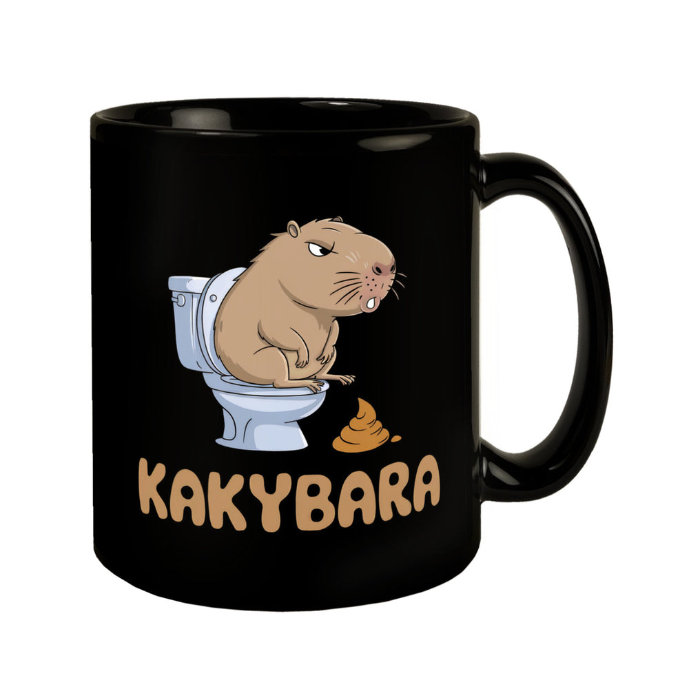 - Die Kakybara Tasse ist wie gemacht für alle, die ihren Kaffee mit einem Schuss Humor genießen möchten! Diese schwarze Kaffeetasse ziert eine lustige Illustration eines Capybaras, das auf der Toilette sitzt. Sein angespannter Gesichtsausdruck ist ein garantierter Lacher! Perfekt für Tierliebhaber und Kaffeefans mit Humor.