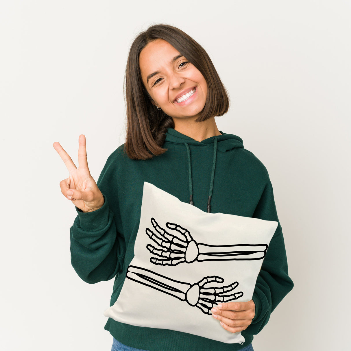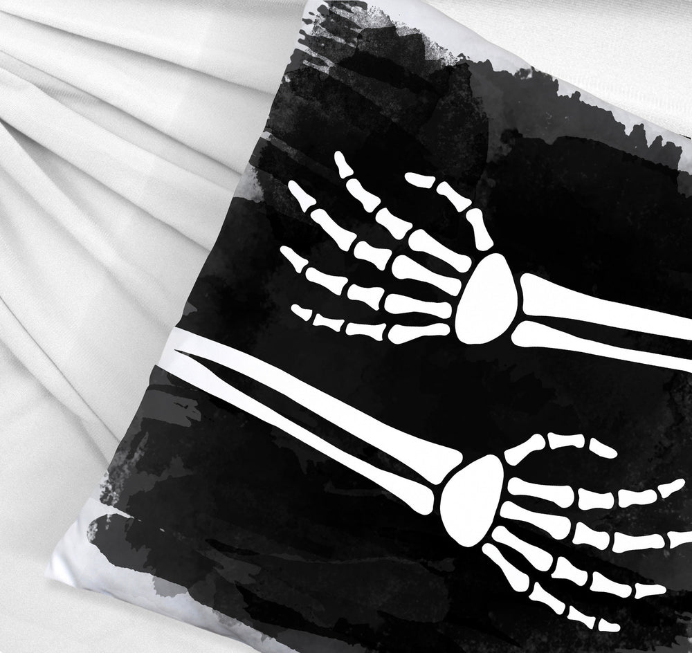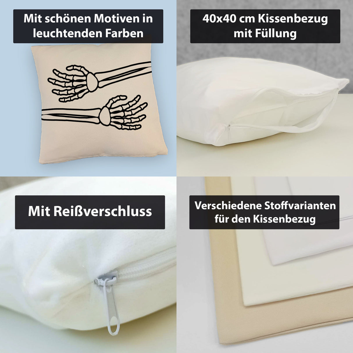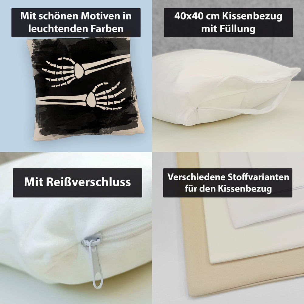 • Kuschelig und schaurig zugleich: Das gruselige Kissen mit Skelett-Arme Motiv. Die knöcherne Umarmung verleiht jedem Sofa einen Hauch von Gothic-Chic. Dieses einzigartige Kissen ist in vier verschiedenen Oberflächen erhältlich, von flauschig bis satiniert. Perfekt für alle, die es gerne ein bisschen gruselig mögen!