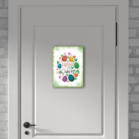 Hallo Frühling Metallschild mit süßen Hasen für Ostern