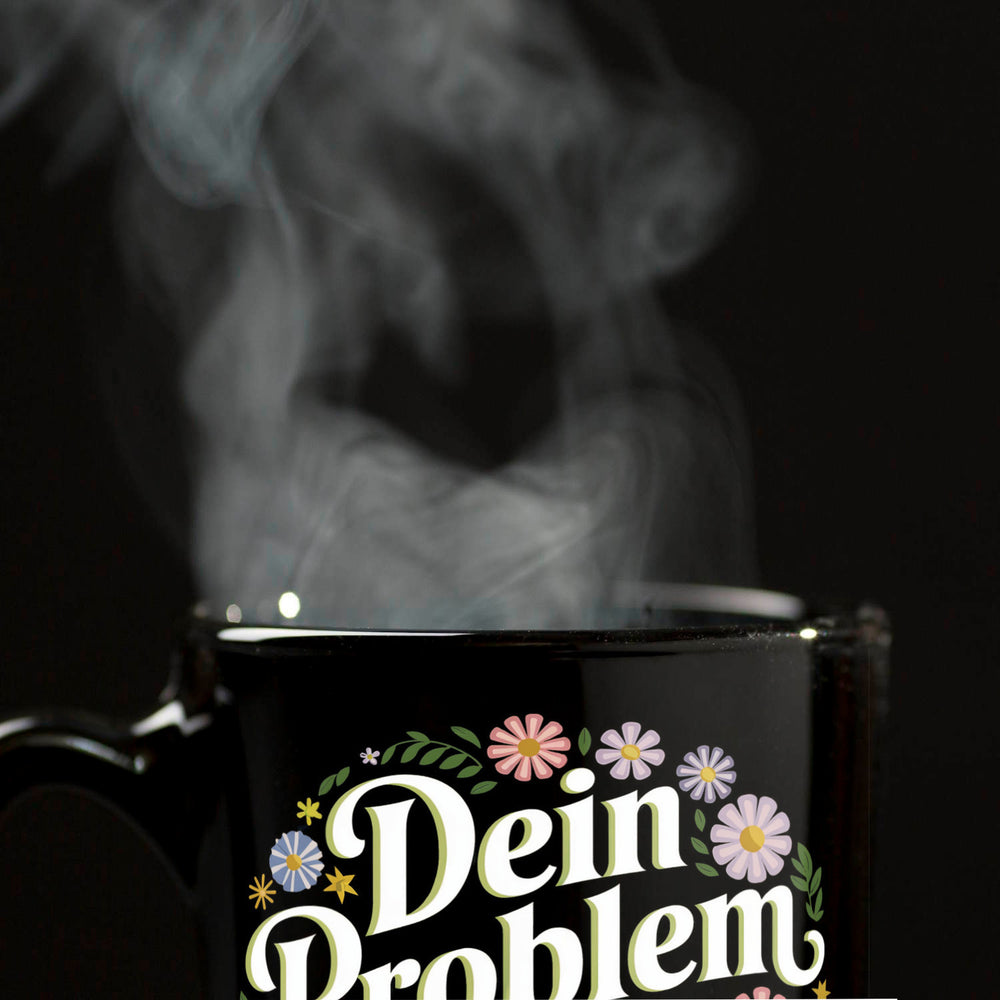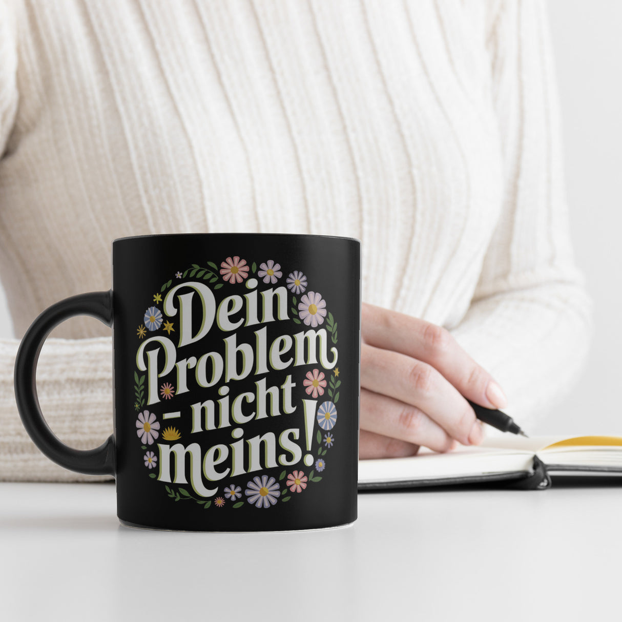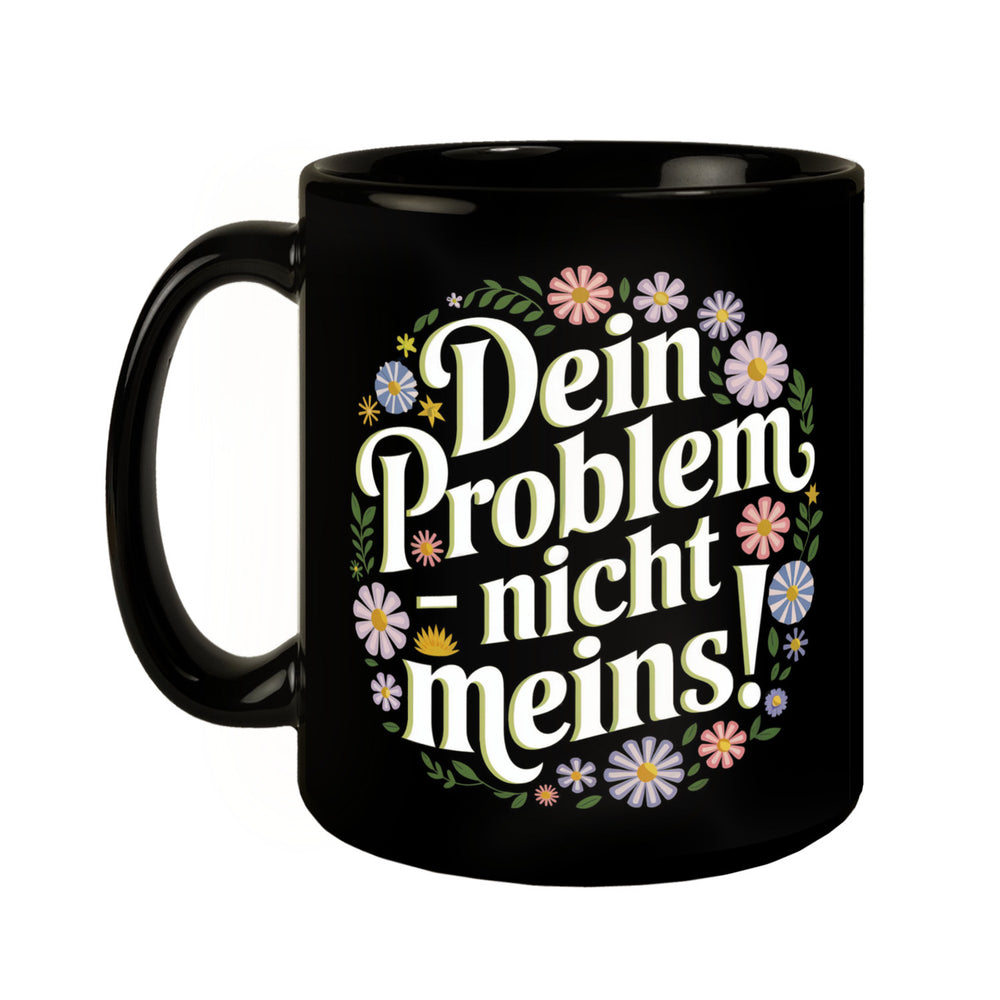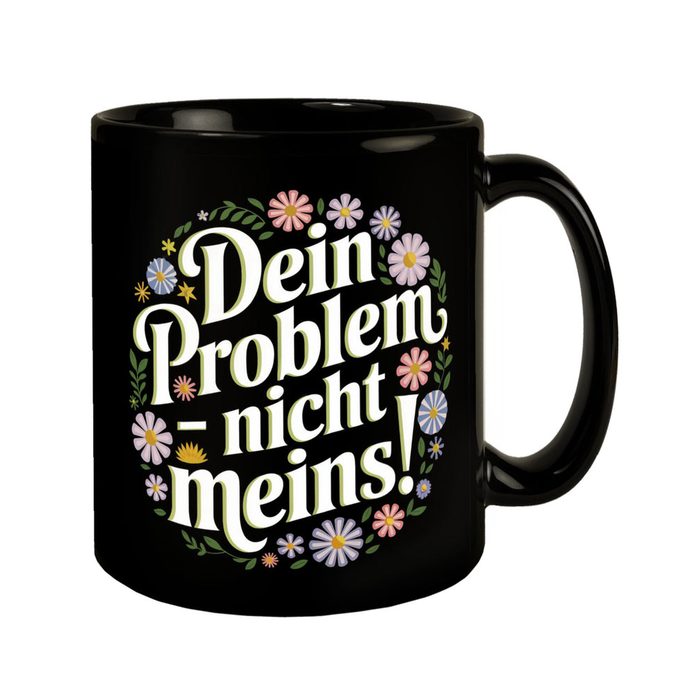 - Diese schwarze Tasse mit dem frechen Text "Dein Problem - nicht meins!" ist ideal für alle, die morgens einen Schub Humor brauchen. Umrahmt von hübschen Blumen, dient sie als köstliche Erinnerung daran, sich nicht über Kleinigkeiten zu grämen. So startet man doch gerne in den Tag!