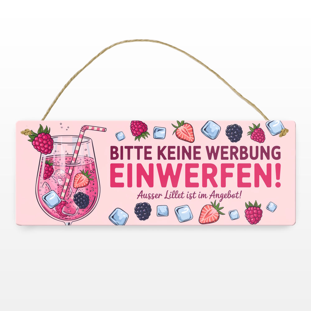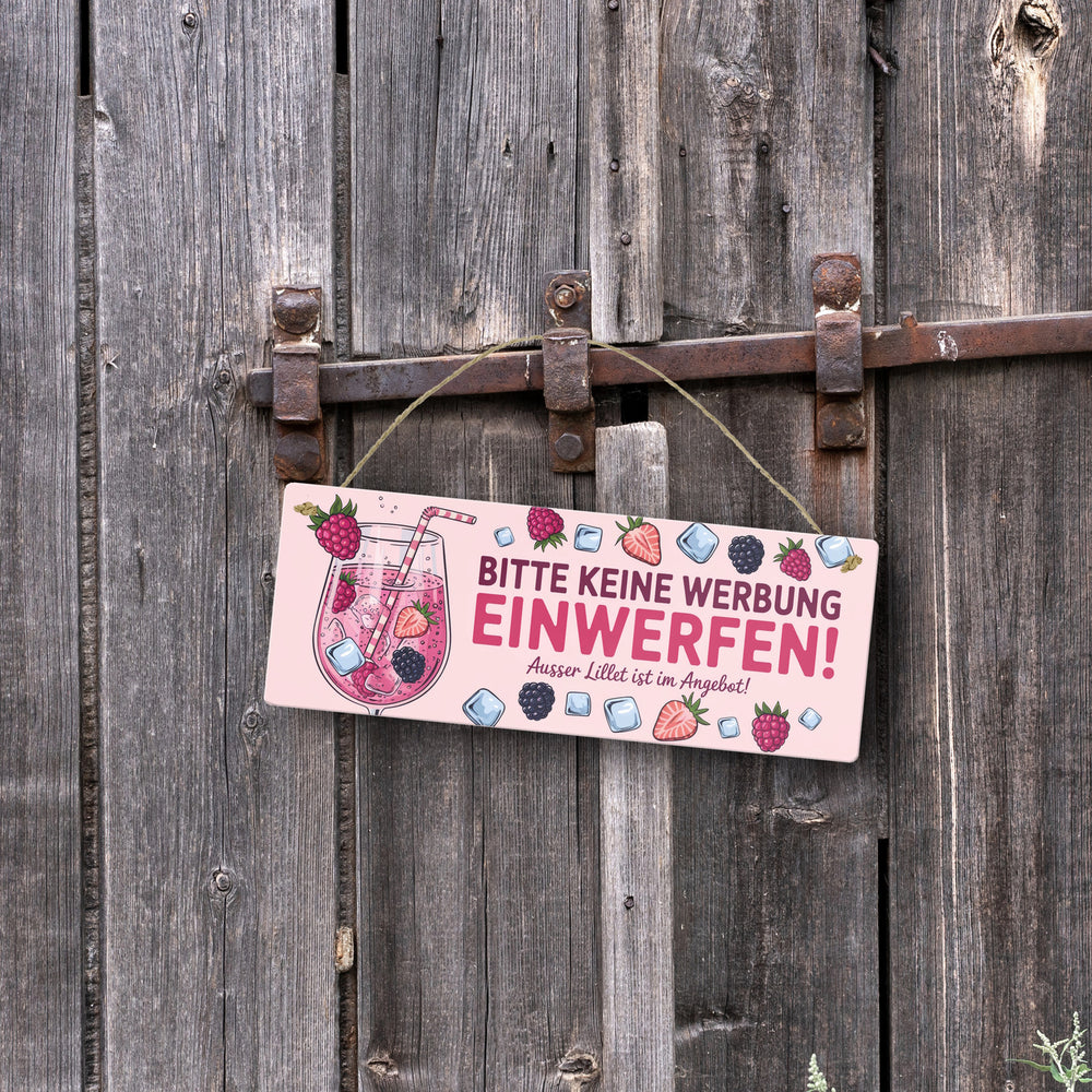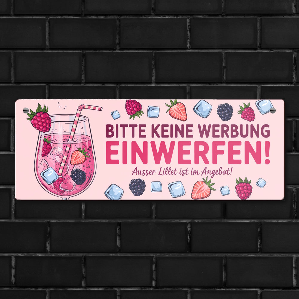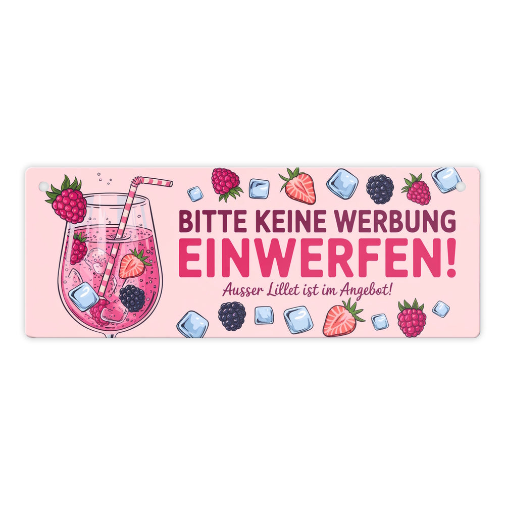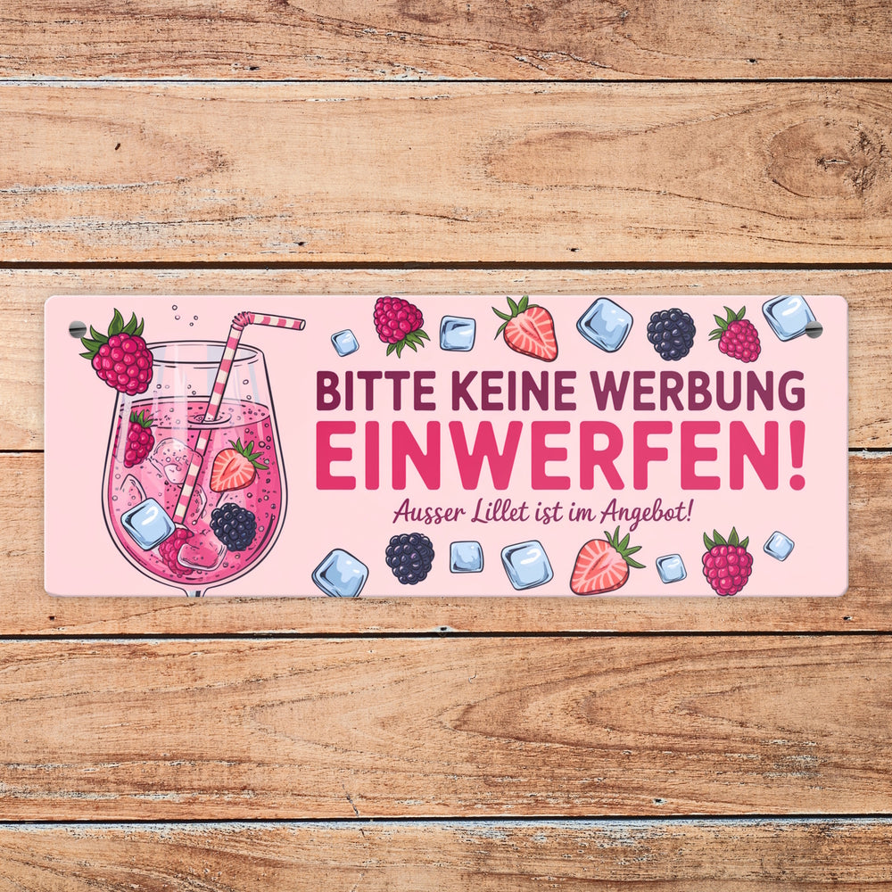 • Dieses Metallschild sprudelt vor Charme und Humor! Es zeigt ein verführerisches rosa Getränk im Weinglas, verziert mit Himbeeren, Erdbeeren und Brombeeren. Ein Strohhalm und Eiswürfel runden das Bild ab. Der freche Spruch "Bitte keine Werbung einwerfen! Außer Lillet im Angebot!" sorgt garantiert für Schmunzler.
