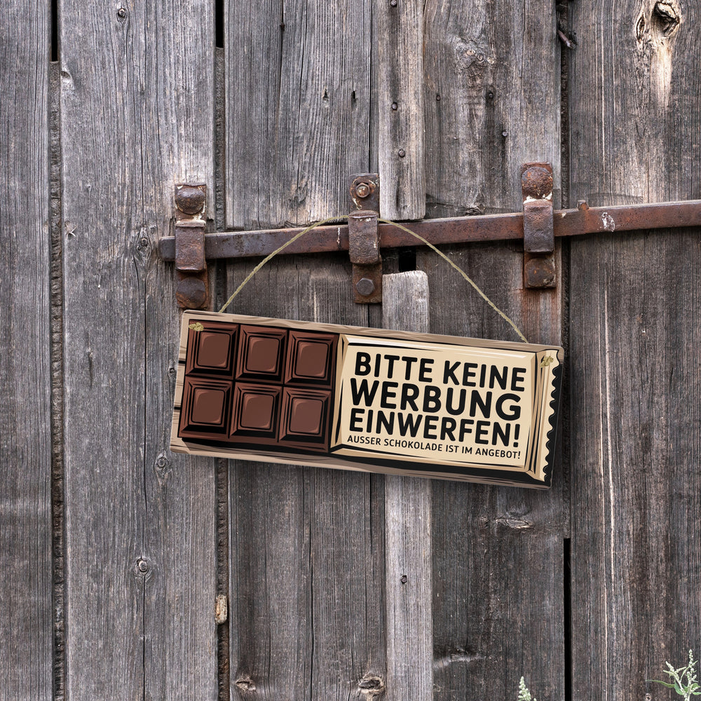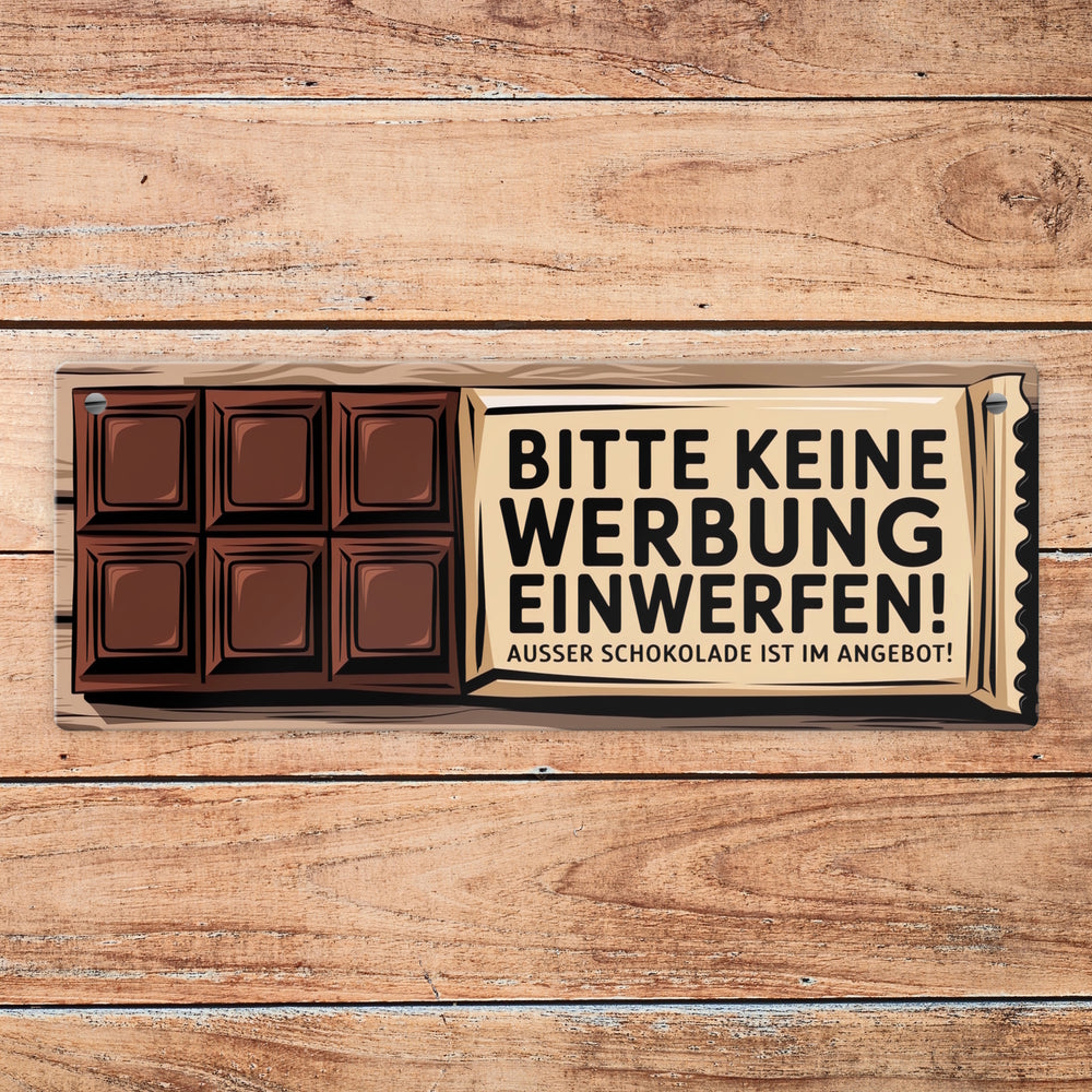 - Das Metallschild zeigt eine lustige Schokoladentafel mit dem frechen Spruch "Bitte keine Werbung einwerfen! Außer Schokolade im Angebot!" auf einem charmant verwitterten Holzhintergrund. Perfekt für jeden Schokoladenliebhaber, der den Postboten zum Schmunzeln bringen möchte.
